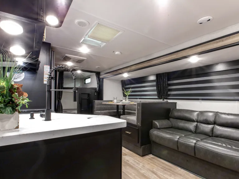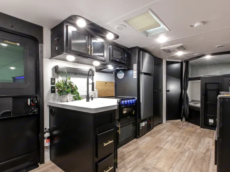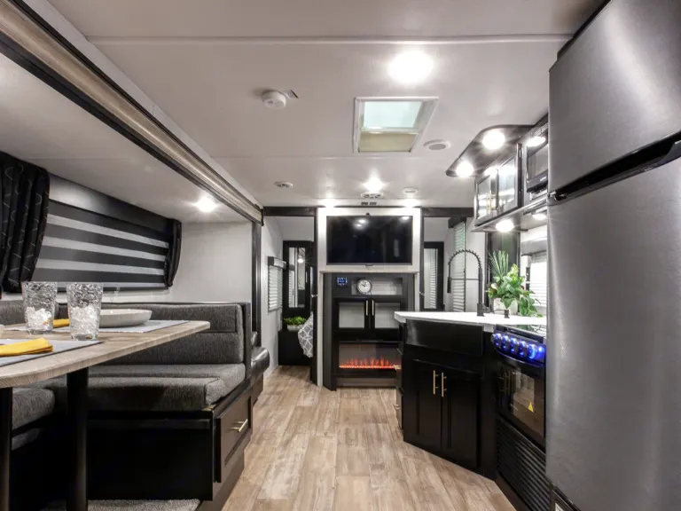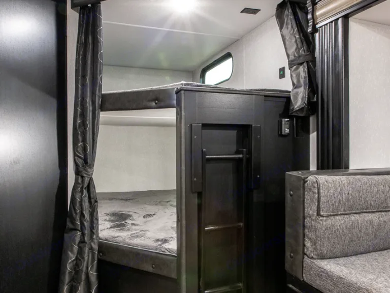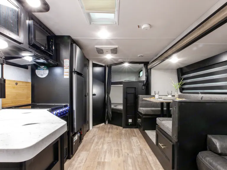 The 26DBH is the ultimate family camper, with a double entry and access to the bath from outside. The double bed bunk, with ladder, provides extra sleeping room for kids and adults. The modern custom kitchen, oversized full pantry and extra-large U-shaped dinette with full length drawers give you more than enough storage for camping gear and supplies. The exterior will provide a great entertaining space with the exclusive Cherokee camp kitchen, exterior speakers and TV bracket as well.