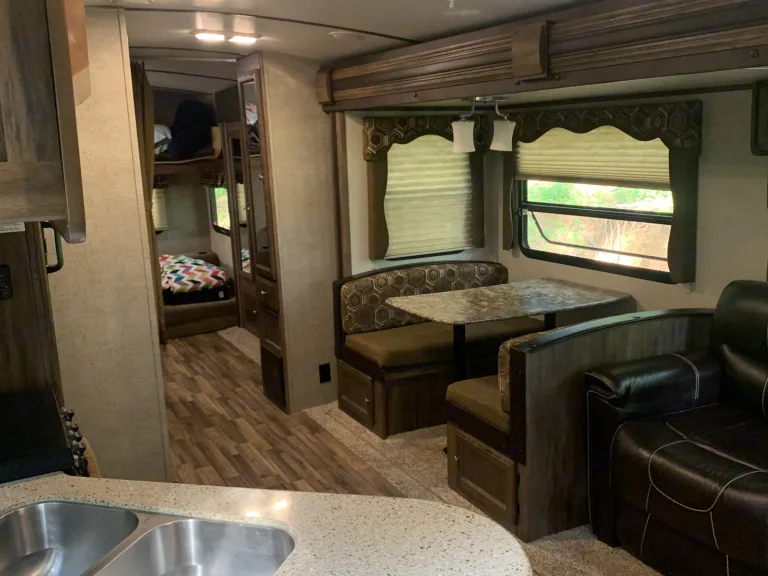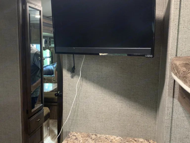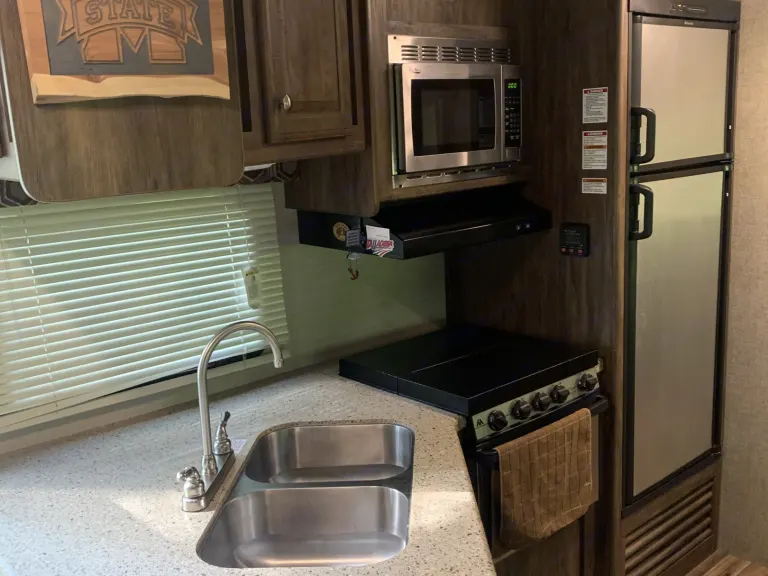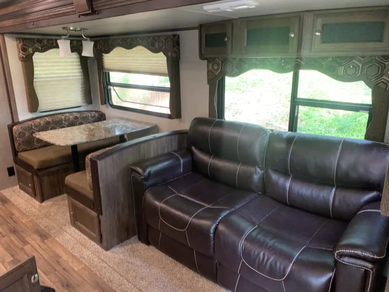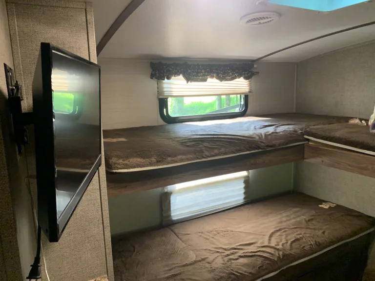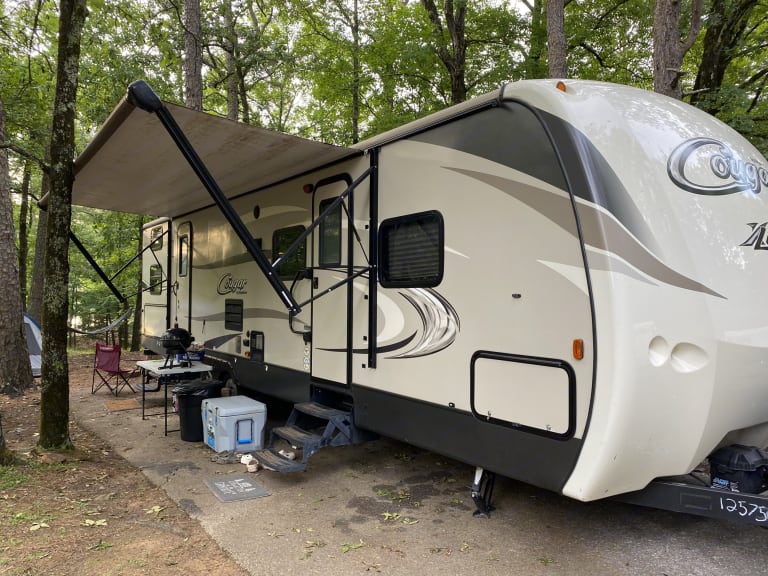 Great and very clean camper that sleeps 8+ with all the comforts you could ask for. Full indoor kitchen with 3 burner stove and oven, refrigerator with separate freezer, microwave, and plenty of storage. 2 TVs, blue tooth stereo with indoor and outdoor speakers, bathroom with separate entrance with shower. Full retractable awning, outdoor kitchen with mini fridge.We can deliver and set up to campsites within 50 miles and will consider further within reasonable distance.RV weight is 7,000-8,000 lbs with hitch weight of 920 lbs.We are very easy going owners and ask that you take care of our camper as if it were yours.What's includedIncludes the following extras: