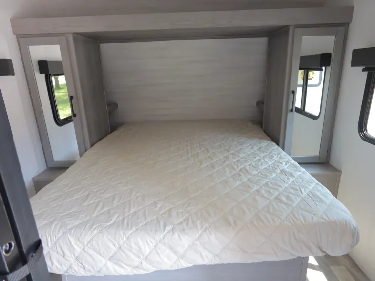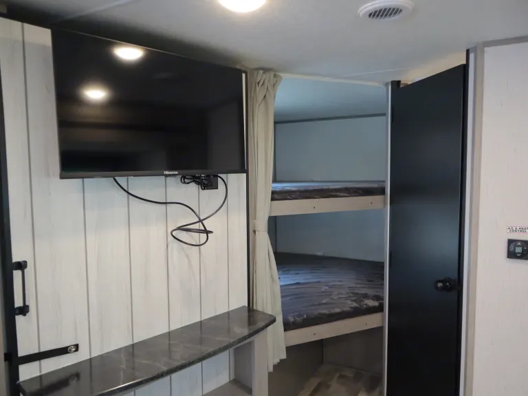 Are you looking for sleeping space for seven to eight campers? Well, you have found it with this Kodiak SE travel trailer. You can sleep in your own private bedroom with a residential walk-around queen bed and dual wardrobes while the other campers sleep on the double-size bunks next to the rear corner full bathroom. The booth dinette and sofa within the single slide offer more sleeping space if needed. The cook will love the L-shaped kitchen, the refrigerator, and the pantry near by to keep everyone fed. The fireplace and hinged entertainment center provide a cozy living area when you aren't outside, and when you want some fresh air, the 14' power awning with LED light gives you an outdoor living space. Just grab your camp chairs from the pass-through storage.