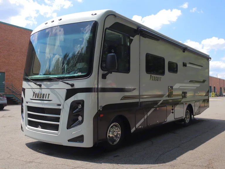 You will be impressed with all that this motorhome has to offer! Starting with the exterior kitchen with a double sink to make for easy clean up and the exterior LED TV to stay up to date with the big game as you cook. The rear private bedroom will have you feeling right at home with the 60" x 74" queen bed that has a Cpap station above it and across from wardrobes on either side of the LED TV and storage space. There is a broom closet for your convenience just outside the full bathroom which has a 38" x 24" shower with a skylight for more head room and natural lighting. The fully equipped kitchen has everything you need to prepare your best meals including a stainless steel microwave oven, and you can enjoy them at the 30" x 70" booth dinette. Relax in true comfort on the 63" sofa with storage below for extra games or movies to watch with the LED TV!Pursue big dreams with one of these Coachmen RV Pursuit Class A gas motorhomes! The high gloss dove grey sidewalls with Azdel superlight composite, fiberglass front cap, and crowned, laminated TPO roof will hold up for years to come. A Ford F53 7.3L V8 engine propels your unit with an abundance of power to each destination. Stay warm in the cooler months with a 30,000 BTU furnace and stay cool in the warmer months with the 15,000 BTU A/C. All of your extra gear can easily be stored in the spacious exterior storage compartments to keep from taking up space on the inside. The exterior propane hook-up will come in handy and you can crank up the tunes with the exterior Bluetooth, plus some models even have an outside entertainment center with a TV. Come find the right one for you today!
