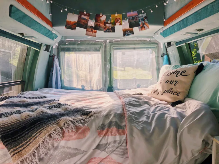 The van has a comfy double-sized bed with a 6" memory foam mattress. The kitchen is equipped with a 2.6-gallon water dispenser with a collapsible sink and a butane stove. There is a 240w power station that will charge your phone, laptop, camera, fans, and many other devices! There is plenty of overhead storage and storage under the bed to fit everything you need for your adventure. The overhead clearance inside the van is 5’ 3”.