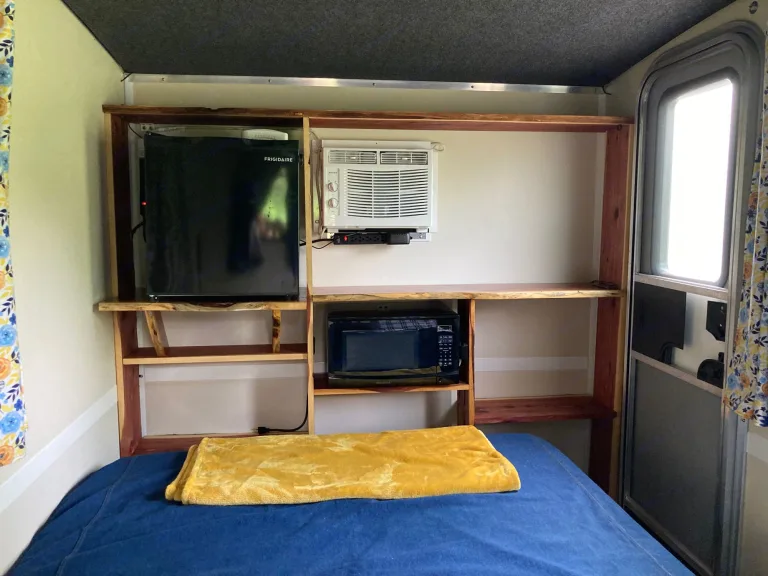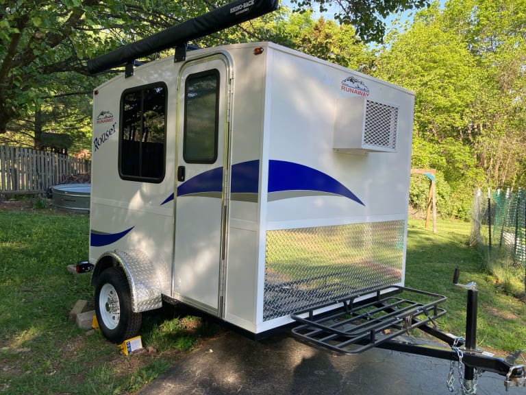 Meet "Haven"! This 2023 Rouser is adorable and ready for your next adventure! 5,000 BTU A/C, space heater and plenty of windows to keep you comfortable. 6'x8' footprint is cozy, and 5'6"-5'10" inside height allows many to stand up. Haven is like a teardrop or “square drop” camper you can actually stand upright in! :) Full-size bed can easily be converted to a couch for more space during the day. Custom cedar shelving and window curtains add to the charm. Mini fridge and microwave make things easy.Front exterior storage rack holds up to 100 pounds, and hitch receiver on back is great for a bike rack or additional storage (150 lb max). Roof rack with attached awning help make sure you're camping in comfort.Uses a standard 3-prong household hookup, but we include 30 amp and 50 amp adaptors in case you need one.2" Ball hitch and 4-prong trailer hookup for the lights required. We might have a ball hitch that would work for you if you don't have your own. Please ask!Be sure to check out our "extras" to make your trip more enjoyable! Our favorite is the camping toilet and pop-up stall, keeping everything right there at your campsite for more convenience.Weight when picked up with normal included items: 1275 lbsWhat's includedFresh Bed linens, two pillows