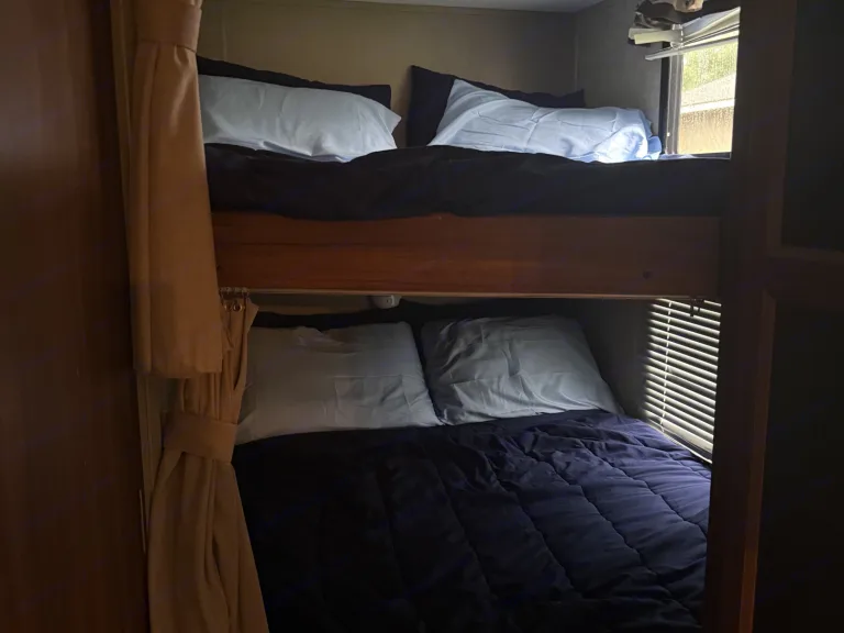 • Front queen bed with privacy curtain and storage overhead