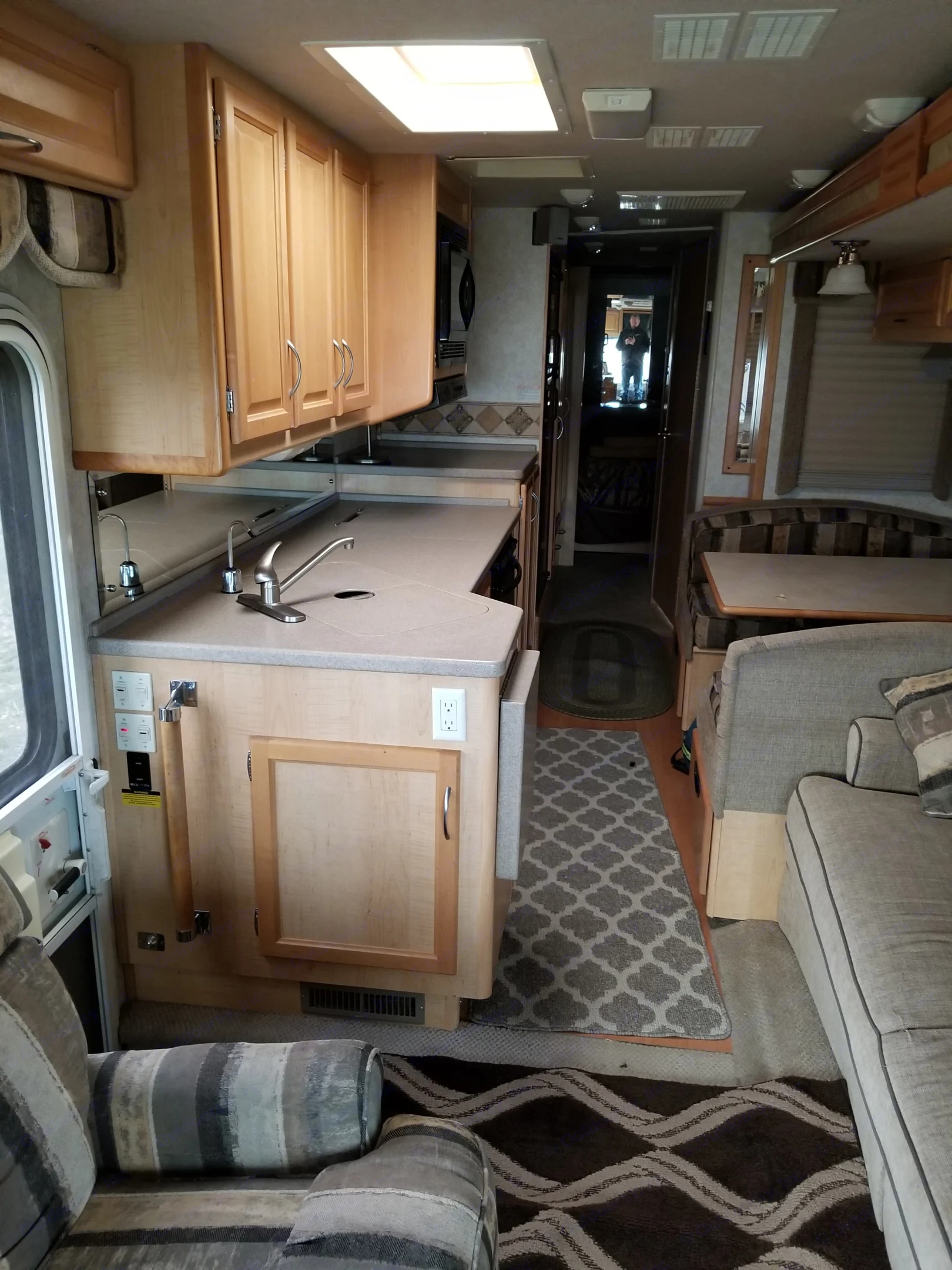 Can sleep up to 6. Queen size bed in bedroom. Couch and table fold out and can be used for beds to sleep 2 smaller people or one large person on each. Includes shower, microwave, stove, range, refrigerator, freezer and lots of storage. Appliances work on propane or hook up. It has 2 large slide outs that create a spacious living room and master bedroom.We have equipped it with a 8 plastic plates, cups, and bowls, silverware, pots and pans, 4 camping chairs, broom and dustpan, hot dog roasters and a drawer full of basic cooking utensils all at no extra cost to make your trip easier. We also supply 4 towels, 2 hand towels, 2 wash cloths, and sheets for the beds.Motorhome needs to be returned with the gas tank full and the sewer empty.