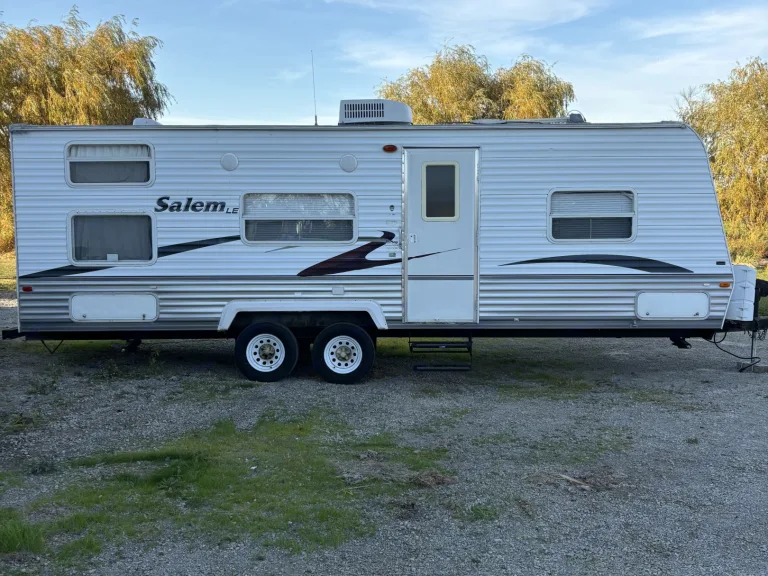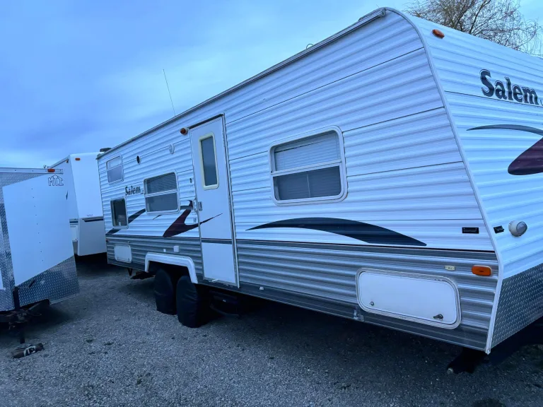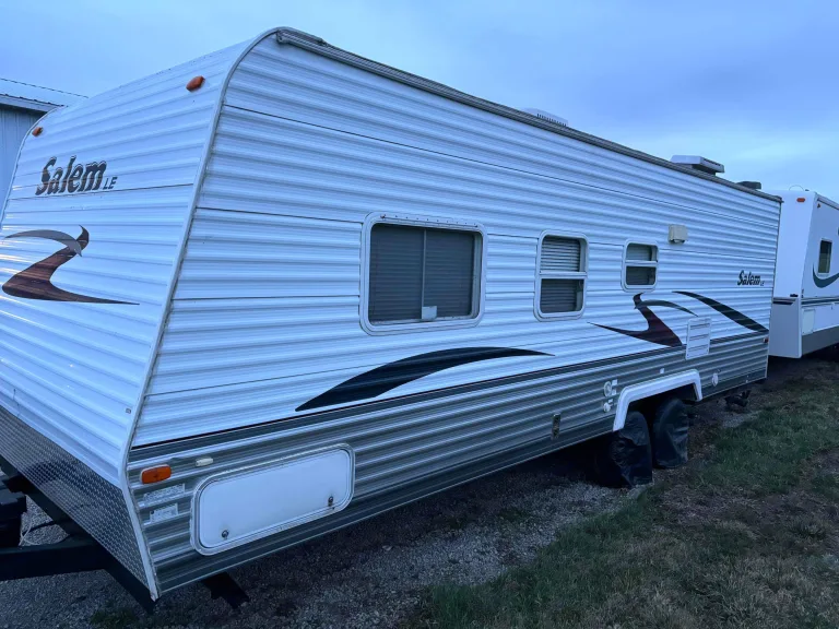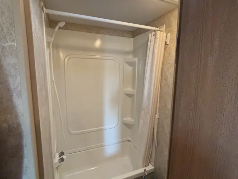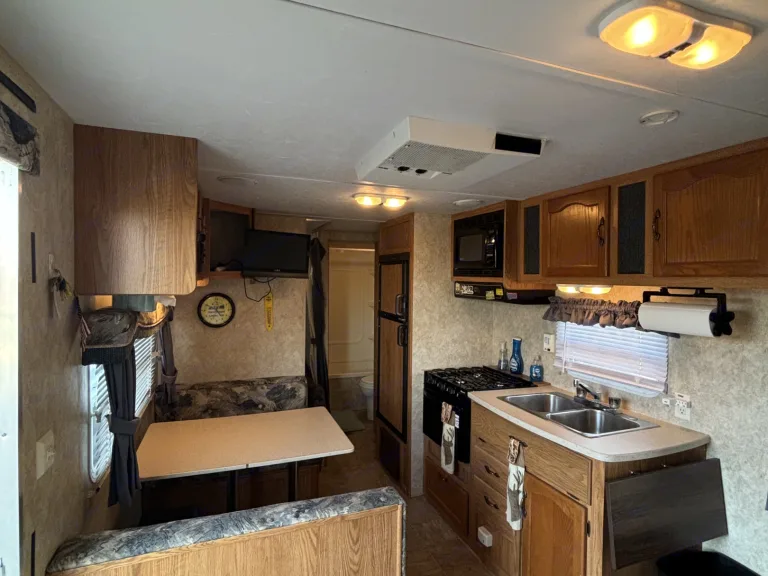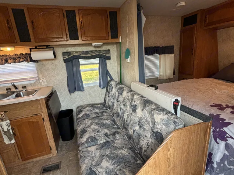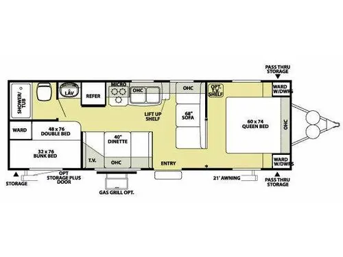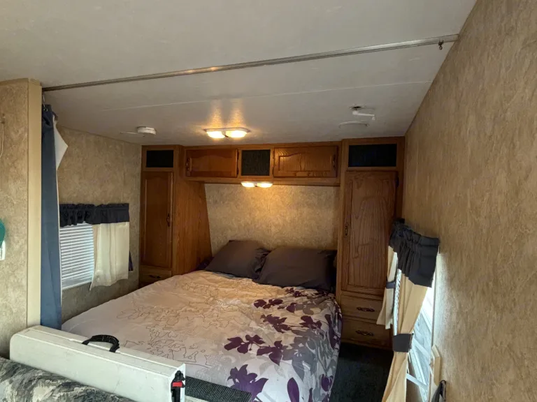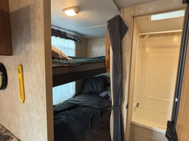 Travel trailer with queen bed, bunk beds with 48" wide lower and 32" wide upper, shower/tub, refrig, stove, microwave.