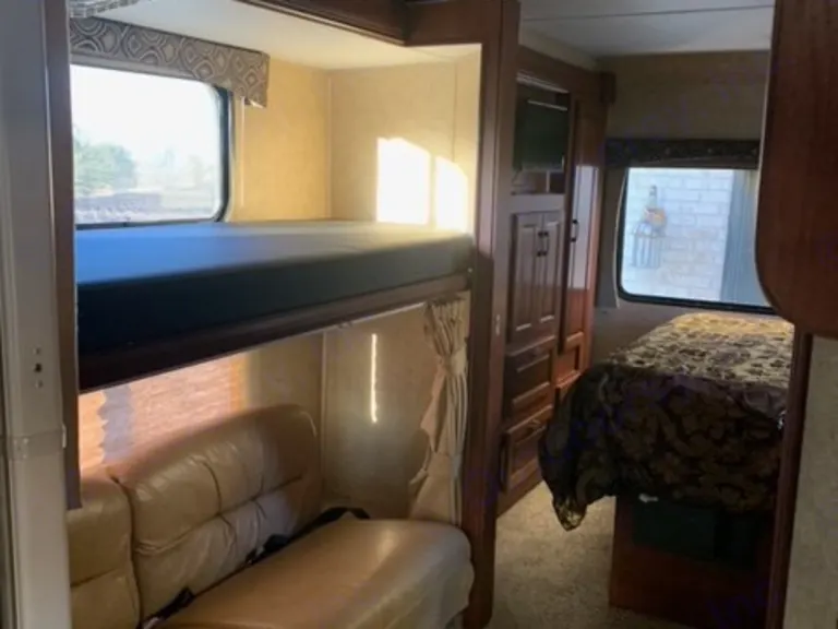 Double Slide Sunseeker Motor Home, Rear Queen Bed w/overhead Cabinets, Double Wardrobes, Flip Down Bunk Slide Out, Kid's Sofa Sleeper, Tub, Storage, Flip-Up Counter, Double Kitchen Sink, 6 Cubic Ft. Electric/Propane Refrigerator. Pantry, 3 Burner Range, Microwave, Sofa Sleeper, Booth Dinette. Linens, towels, dishes, pots & pans, etc. included.