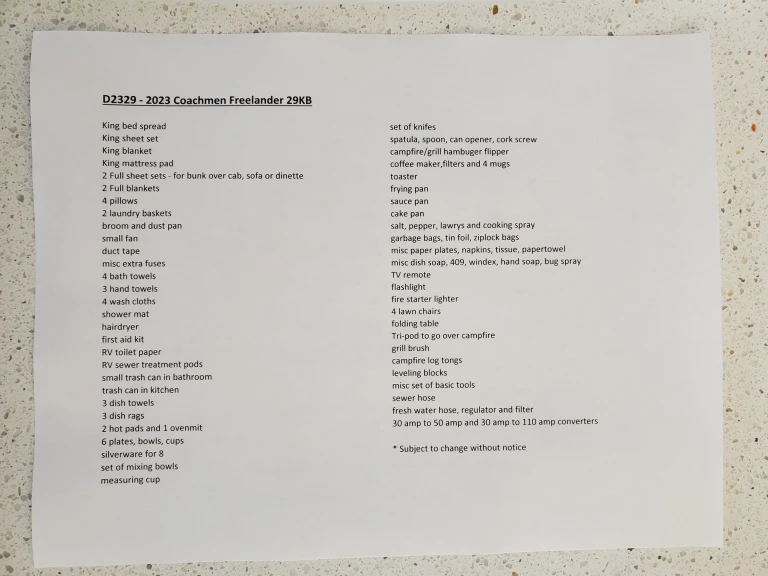 2023 Coachmen Freelander 29KB Class C motorhome. Sleeps 8 (4 adults and 4 small children) with a king size bed in the back, a 62" Jackknife Sofa, 44" x 76" J-Lounge dinette, and 57" x 95" bunk above drivers cab. Automatic levers and double slide outs for lots of room. A swing-arm TV inside and outdoor entertainment center, 10 cu. ft. 12V refrigerator, back up camera, large closet in bedroom for hanging clothes. Includes linens, dishes, cookware, lawn chairs, fire tongs, cooking grill, and more.IPass transponder furnished in RV, renter is responsible for all toll charges.Pick up and drop off times are flexible if it is arranged ahead of time.Mileage - 100 miles per night included with rental for free. Excess mileage is $.35 per mile.