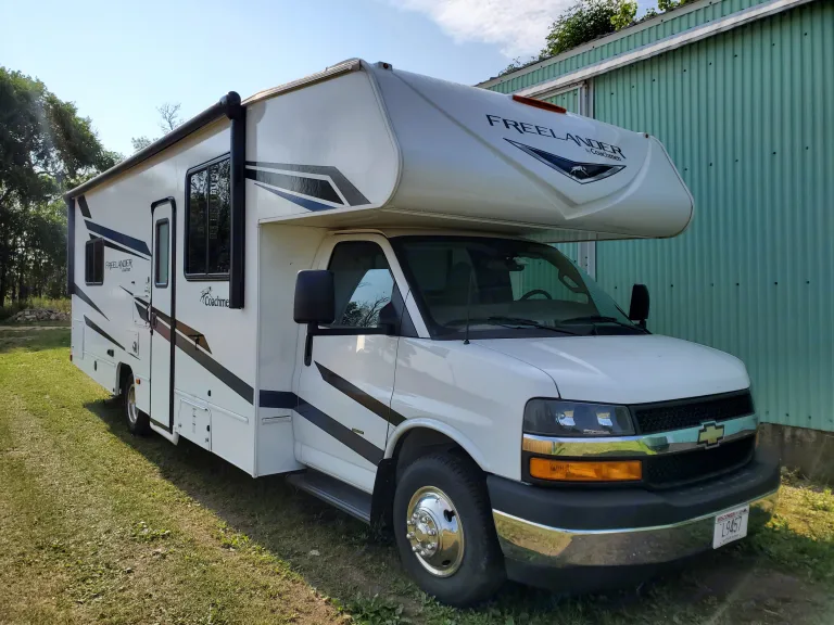2023 Coachmen Freelander 27QB Class C motorhome. Sleeps 6 with a queed size bed in the back, a 62" Jackknife Sofa, 42" x 71" dinette, and 57" x 95" bunk above drivers cab. A 32" swing-arm TV, 10 cu. ft. 12V refrigerator, back up camera, lots of overhead storage. Includes linens, dishes, cookware, lawn chairs, fire tongs, cooking grill, and more.IPass transponder furnished in RV, renter is responsible for all toll charges.Pick up and drop off times are flexible if it is arranged ahead of time.Mileage - 100 miles per night included with rental for free. Excess mileage is $.35 per mile.