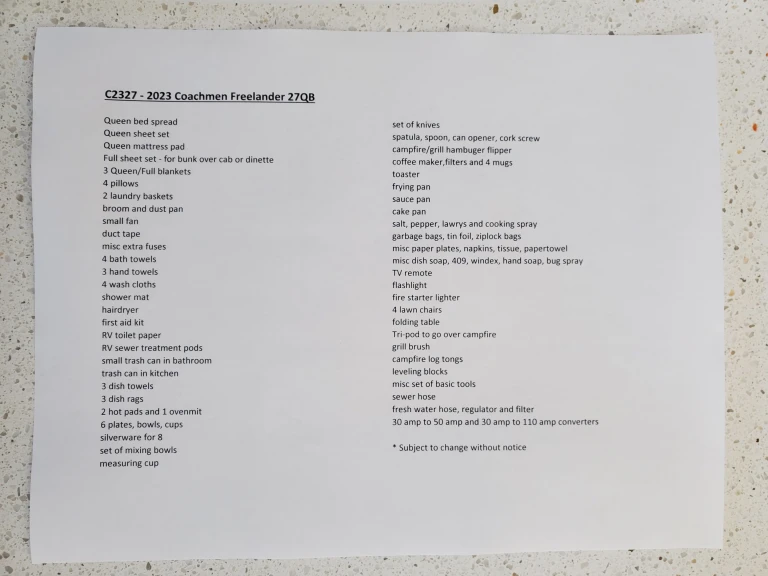 Must be 25 years old to drive, no smoking or vaping, no climbing on the roof, no tow vehicles, adult dogs will be considered with owner approval only, RV must be returned as clean on the inside as you received it.