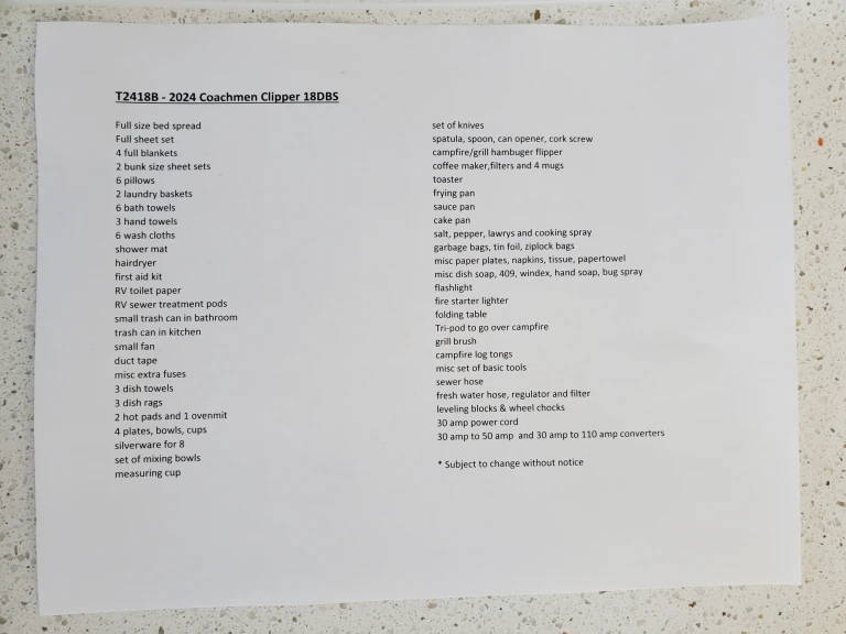2024 Coachmen Clipper 18DBS travel trailer. Light Weight tested Sub-4000 lbs. Sleeps 5-7 (5 adults and 2 small children) with a 54" x 74" murphy bed, jackknife sleeper sofa and 42" x 72" bunk beds. Sofa sleeper slides outs for lots of room. 7.0 cu. ft. Gas/Electric Refrigerator, 2-Burner Cooktop, Microwave, 20K BTU Furnace, Roof mounted A/C, 6 Gal. Gas Water Heater, 4 Stabilizing Jack, Anti-sway hitch with 2" ball provided. Tow vehicle needs 7-pin trailer connector and electric brakes. Wisconsin law requires pulling 3000 lbs. and over to have electric brakes. If you don't have a brake controller installed in your vehicle, you must rent our portable controller that uses an app on your smart phone for $25. Includes linens, dishes, cookware, lawn chairs, fire tongs, campfire tri-pod, and more.Pick up and drop off times are flexible if it is arranged ahead of time.
