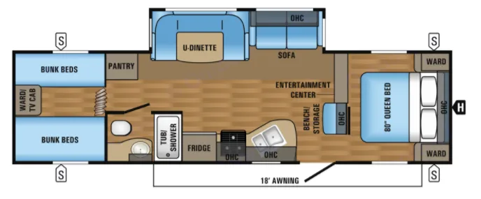 1 year old, All upgrades ( all LED lights indoor and out., outlets at all beds LED, Thermal package) sleeps 9, 4 bunks in the back (2 twins, 2 narrow twins) and a Queen in the front. Bathroom with shower and tub.