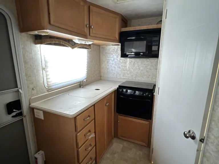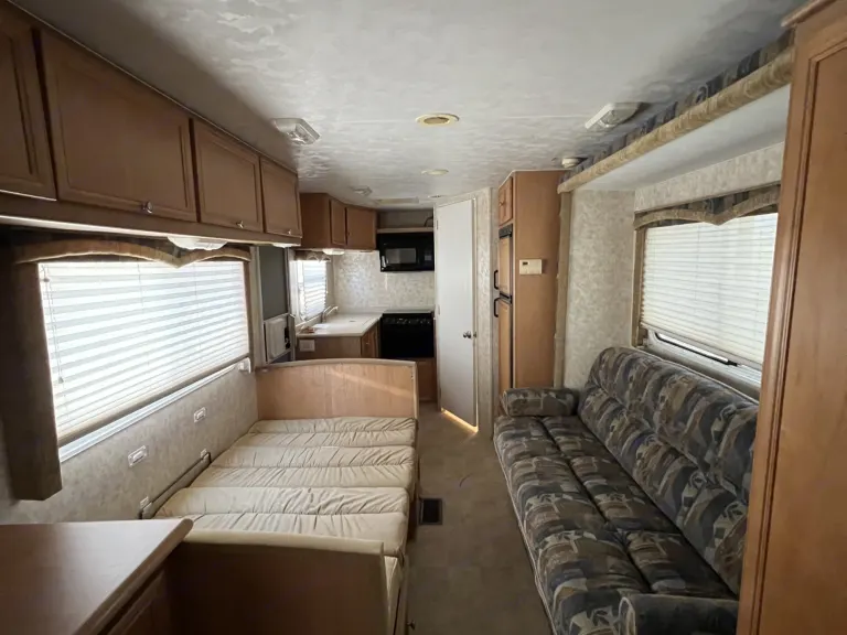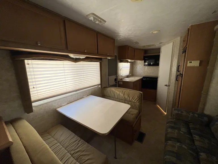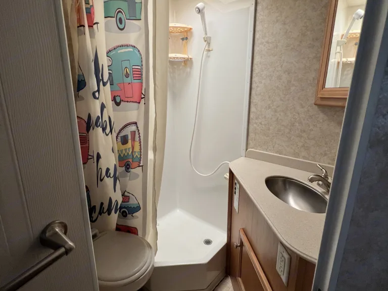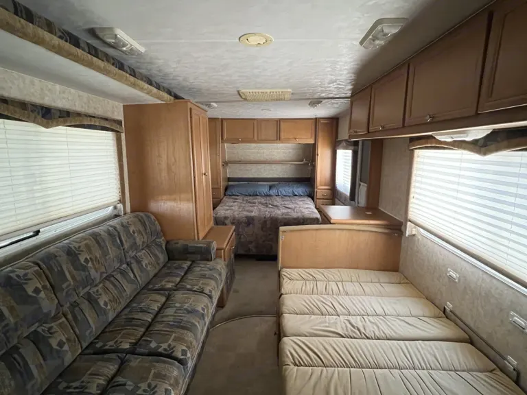 A whole house on wheels like you never left home. A/C and Heater. The kitchen comes equipped with stove, oven, microwave, Keurig or coffee pot, sink and cutting board. You get a bed with his and her closets and night lights. A living space with couch and dining table. Both bed and dining table convert to beds. Relax outside under the awning in the shade. Plenty of storage. There is a TV stand and radio for entertainment. Bring your memory making skills!What's included• Kitchen utensils