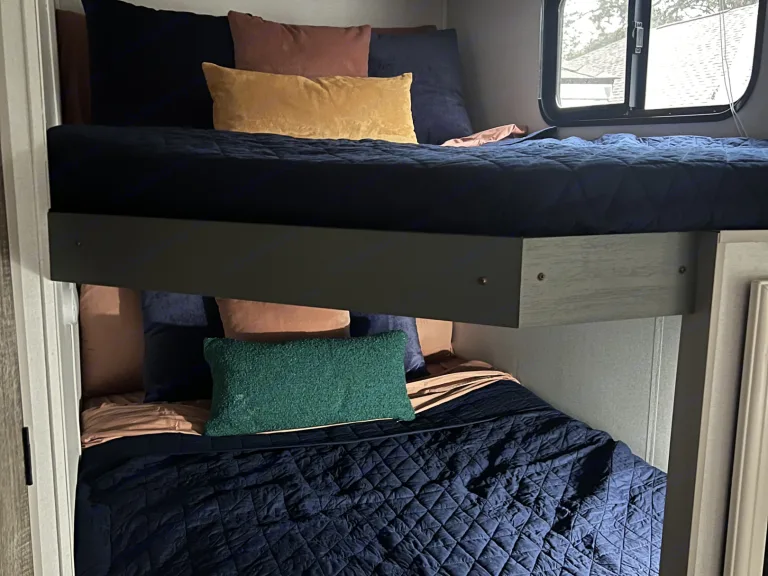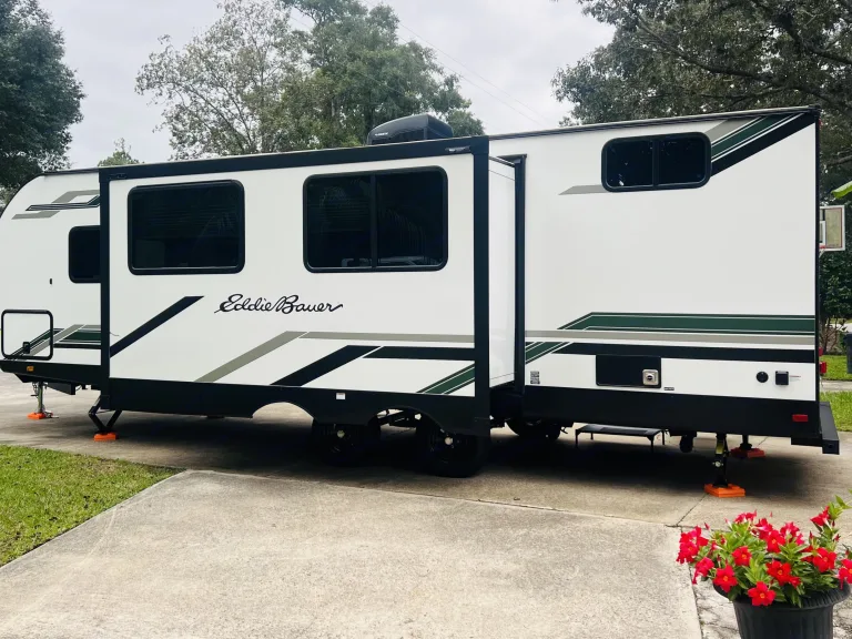 Experience the perfect blend of comfort and class in our 2024 Heartland Eddie Bauer Edition travel trailer — your luxurious home away from home. This spacious and beautifully designed camper sleeps up to eight guests (six adults comfortably), making it ideal for families, couples, or small groups seeking an inviting getaway without sacrificing modern convenience.Inside, you’ll find a fully equipped kitchen featuring a stove, oven, microwave, refrigerator, and deep sink — everything you need to cook your favorite meals on the road. The dinette and sofa both convert into extra sleeping areas, and a set of full-size bunk beds offers plenty of room for everyone. The private queen bedroom provides a cozy retreat with a door for added privacy.The bathroom includes a toilet, shower, sink, and vanity mirror, so you can freshen up with ease after a day of adventure. Enjoy movie nights on the large flat-screen TV, unwind in the stylish interior, and soak up the upscale touches that make this trailer feel like a boutique suite on wheels.To ensure a hassle-free experience, we personally deliver and set up the camper at your chosen campground — all you need to do is arrive and relax!