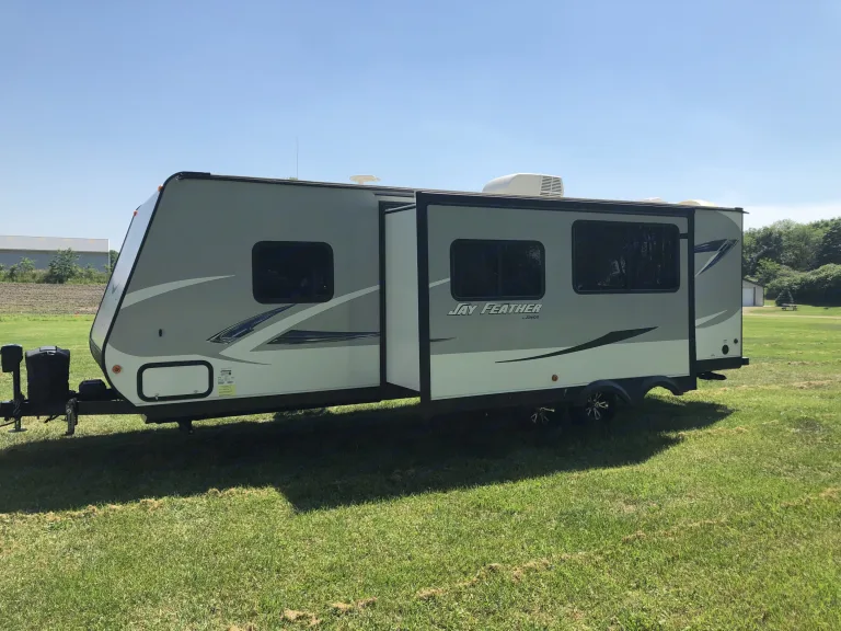 This is a very nice newer travel trailer which offers a spacious floor plan and many features. Features include flat screen tv which is reversible to main area and master bedroom, cable tv hook-up or aerial antenna, stereo with both indoor and outdoor speakers, sleeps up to 8 persons with a new memory foam mattress in master bedroom, bunk beds, table and couch both convert to beds, awning, slide out in living area, full bathroom, LED lights throughout including under the awning, refrigerator, microwave, stove, oven, air conditioning, very easy to tow.
