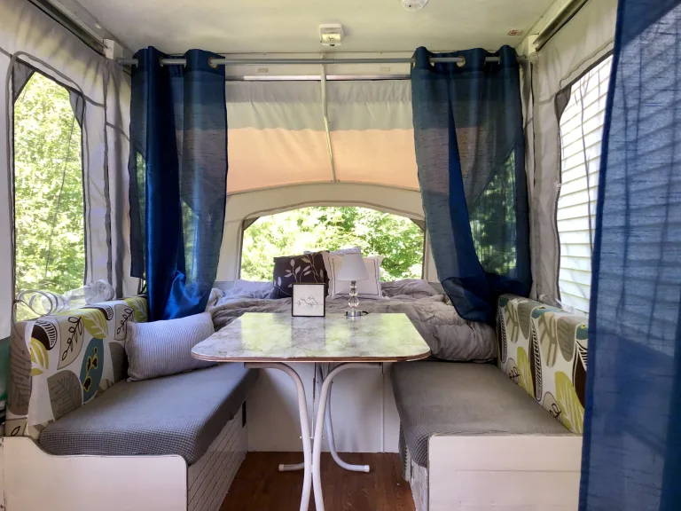 This adorable pop-up camper was lovingly renovated in 2019. The length is 12’ for towing, 17’ extended. It is 6’ 8” wide.The camper is spacious as the old bulky kitchen has been removed in favor of a standard cooler (kept in tow vehicle) and a retro breakfast station with coffee maker, hot plate and tiny toaster oven.Accommodations include two full size (48” x 72”) beds as well as a dinette that converts to a 41” x 71” bed. It has remote controlled LED color changing puck lights as well as electric operated lights. Also included in the rental fee is an oscillating fan, small ceramic space heater and complete set of privacy curtains.Pet policy: negotiable, with a pet cleaning fee of $50 per trip.