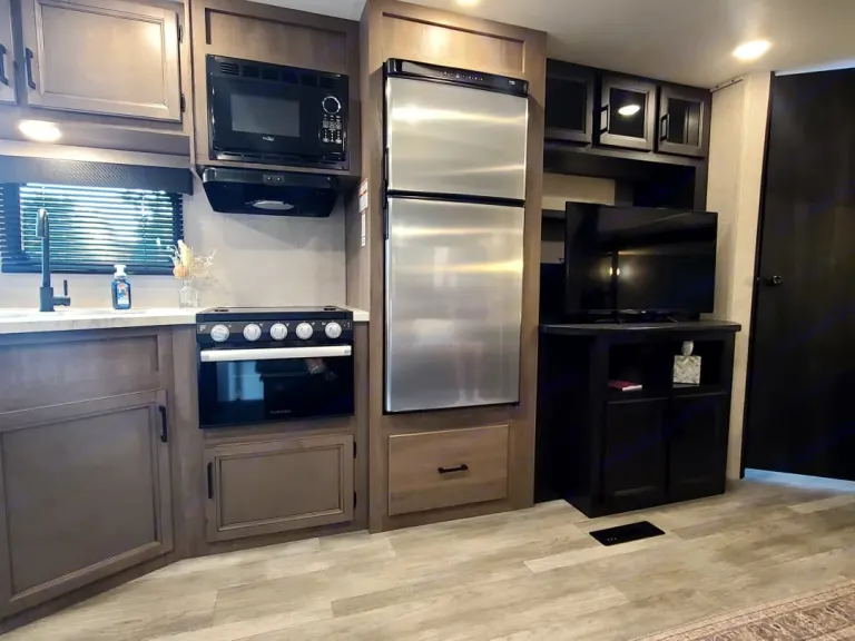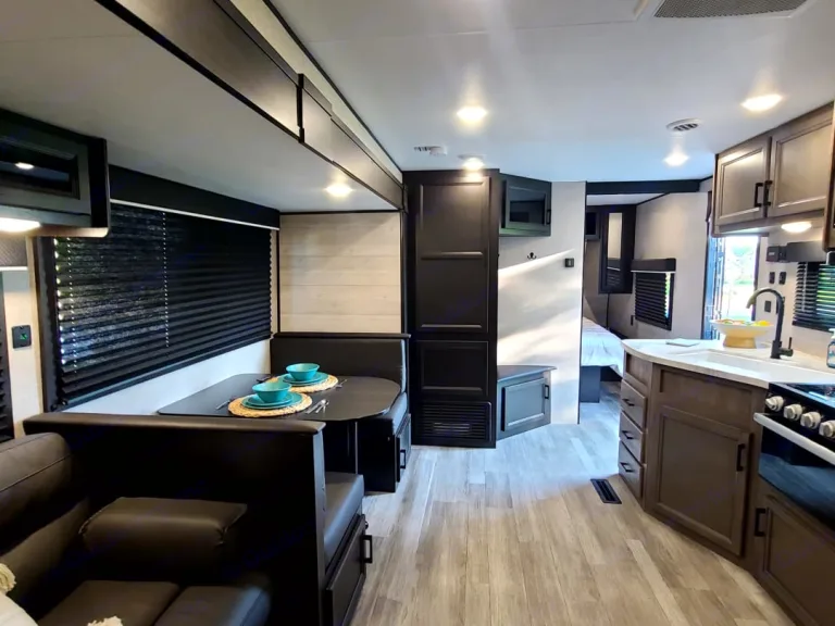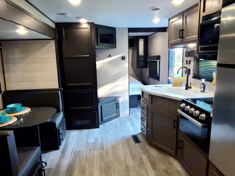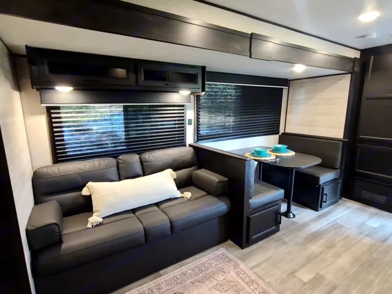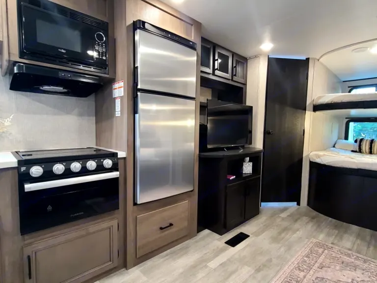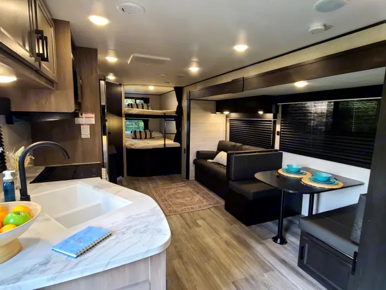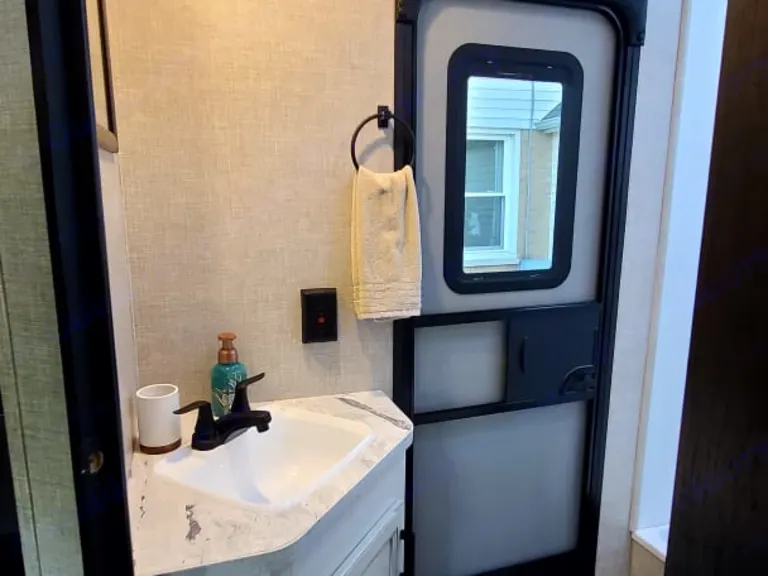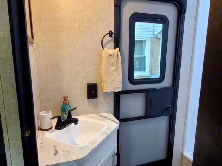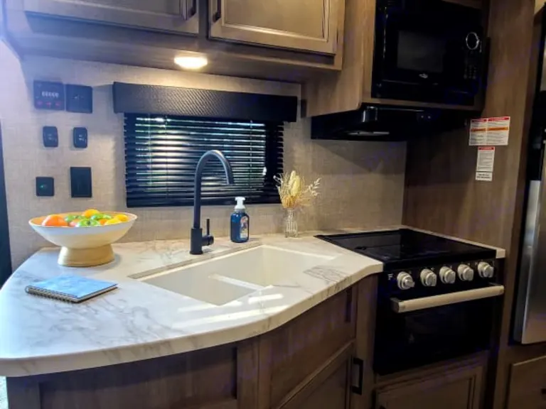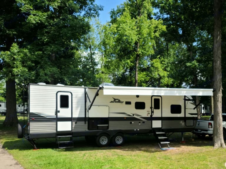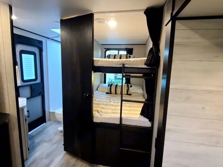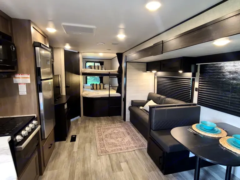 Welcome home! Our 34 foot all-seasons camper is the perfect home away from home! Comfortably sleeps 8-9 guests throughout, whether it is in the queen size Casper matress in primary room, the full-sized memory foam bunk beds, the fold-out sofa, or the convertible dinette. There is a 42" flat screen with built in HD antenna to enjoy all of the local channels. A bluetooth stereo system with indoor and outdoor speakers throughout. USB ports to charge electronics. Full kitchen equipped with all of the necessities. Plenty of storage. 20' electric awning, outdoor led lighthing, outdoor fridge, and outdoor shower. We offer everything you need for the perfect getaway plus much much more!What's included• Linens