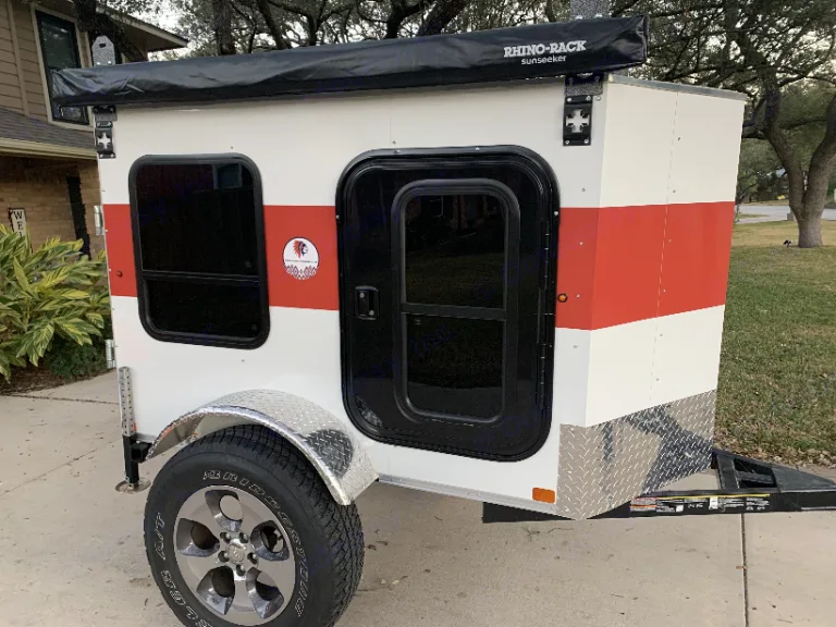 This is a compact offroad camper, ideal to join your friends on weekend adventures. The inside has enough room for a single twin mattress, and the roof rack on top is suitable for bring along your kayak and fishing poles. An awning is also attached to the camper, to provide additional shade if necessary. This unit has a 4" lift, as well as full size All Terrain tires to provide easy towing. At roughly 700 pounds when empty, this little camper can be pulled by most tow vehicles.What's includedA twin mattress with clean linens, blankets, and pillow are available if desired.