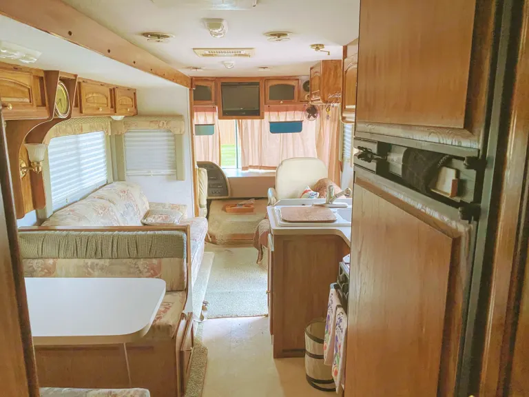 RV comes equipped with full bathroom. Complete kitchen - Stove - Microwave, oven, storage & cabinet space!