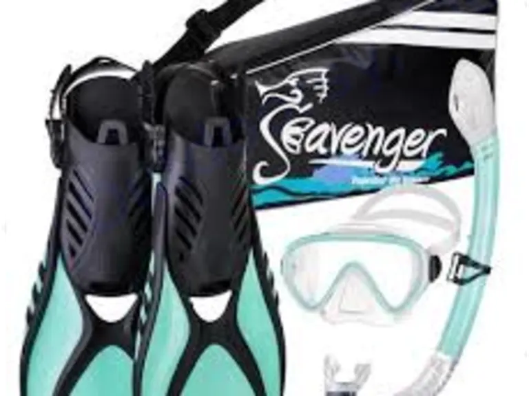 Snorkel set comes with goggles, fins, and snorkel.