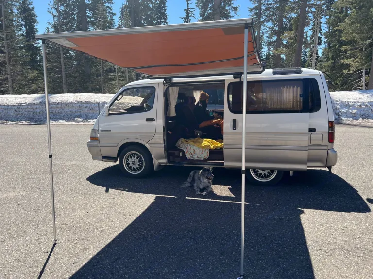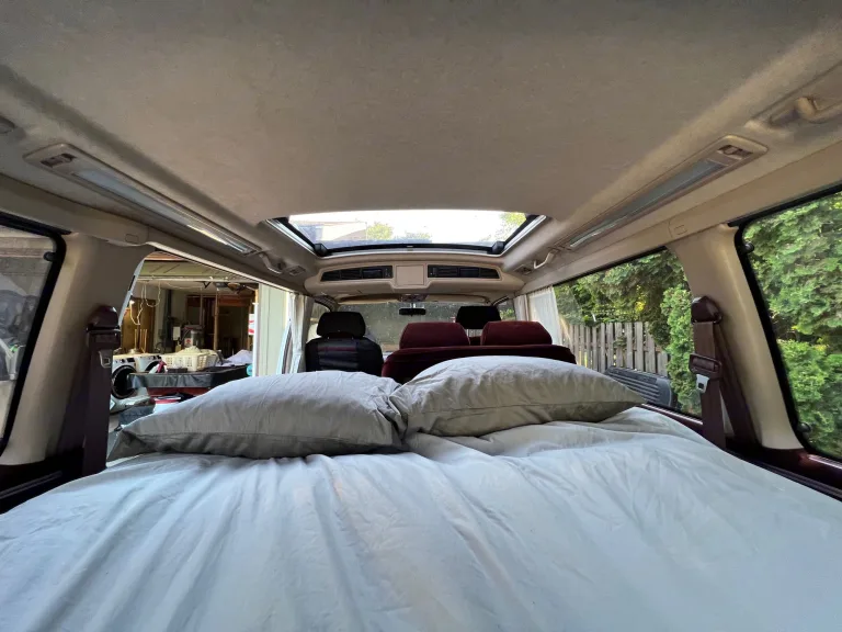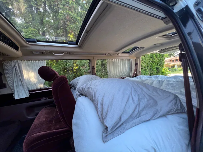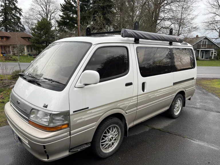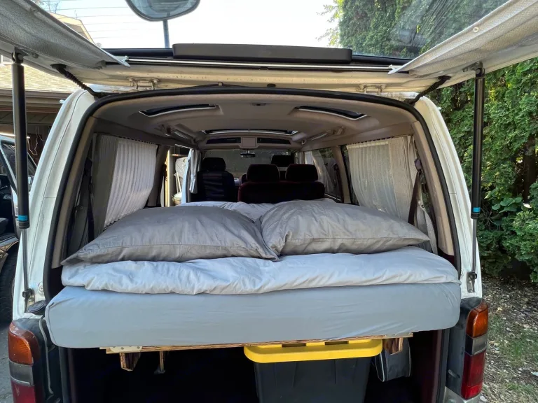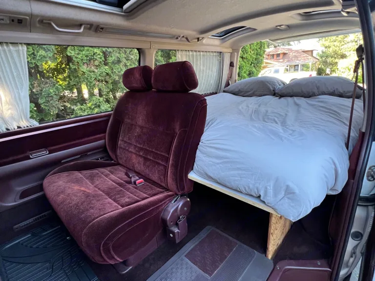 Juniper is a 1993 Toyota Hiace that is Right hand drive and rear wheel drive. Juniper has an automatic transmission and gasoline engine. Juniper will not win the race on the road but she will get you there with a lot of windows and sunroofs to enjoy the journey and take in all the views. There is a touch screen Bluetooth head unit with charging/connecting usb port. There are seats/seatbelts for 4 people and a 2 person 6” thick memory foam bed. The bench seat swivels and can be used for extra length/leg room for people over 6’1” or so.
