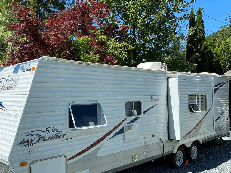 Spacious and clean 29' Jayco which sleeps 8. Toilet, shower, kitchen and separate master bedroom with a full queen size bed. Full and twin bunk bed with foldable couch and dining areas that also turn into beds. There are many beautiful campgrounds in and around Hope including gorgeous Manning Park only 40 minutes away. Heating and air conditioning and easy to tow, ready to go for your next adventure!What's includedPlates, dishes, cups mugs, cutlery utensils pots pans frying pan etc We have camp chairs if requested:)
