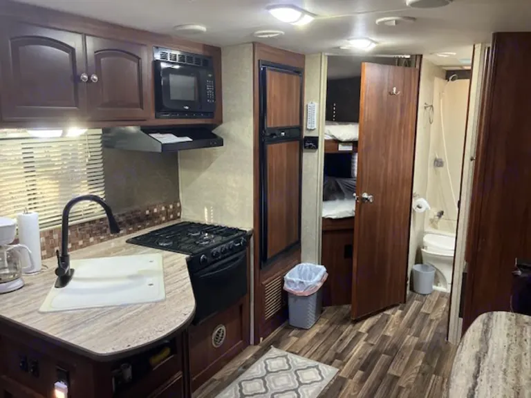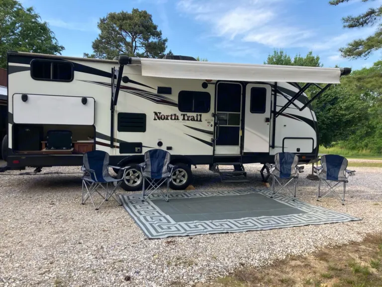 Travel trailer with outdoor awning that sleeps 6-8 people.