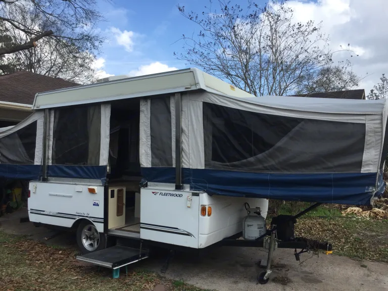 Simplify, Simplify, Simplify. Pop-ups are a great way to camp, short or long term. Set up is quick and easy, and this Fleetwood has an automatic device to raise and lower the roof. No hand cranking! It can comfortably sleep 5, maybe 6 if you have small children. There is a King size bed (see photo with the broom and the egg crate padding added), and on the opposite end there is a Full size bed (see photo with the broom for perspective.) The twin size bed converts into a dining table, though I prefer to eat outdoors!Other conveniences include a 3 burner stove which runs on propane. The small fridge will hold essentials like milk, bacon, eggs, and a six pack or two. There's plenty of storage space for dry goods as well. With a water hook up, you can wash dishes in the sink or rinse in the outdoor shower. For hot Texas days, the A/C keeps you nice and cool! There's a port-a-potty which you can easily empty at the park's dump station.For fun and leisure, I've included camp chairs, a waterproof cushioned ground mat, and ladder golf. There are basic cooking supplies, plates, cups, cutlery, and dish towels. Additionally, I've provided a camp stove and converter hose which hooks up to the propane tank. I like to set up and cook outside under the trees! Additionally, I've got paddleboards that you can rent if you're headed lakeside! Just send me message for details.When open, the camper measures 21 ft. 4 inches long.Pick up time on weekdays is 4 pm. Weekends - more flexible.