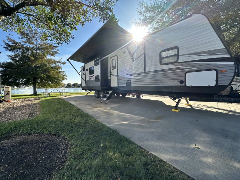 37 foot camper is great for family outings, music festivals, trail rides, tailgating, and other exciting events.To keep you entertained, we have family games and surround sound (indoor and outdoor).When extra bed space is needed. It can accommodate 2 people with 1 queen bed and 4 people for twin size bunks and jack knife.Our unit is equipped with a 50 amp electrical plug. A 7500 inverter powerhorse generator provided when added on.Camp Wright has an outdoor kitchen and shower.You can't go wrong Camping Wright!What's includedkitchen- pots, pans, cooking utensils, dining ware, paper towels, dish detergent, cleaning supplies