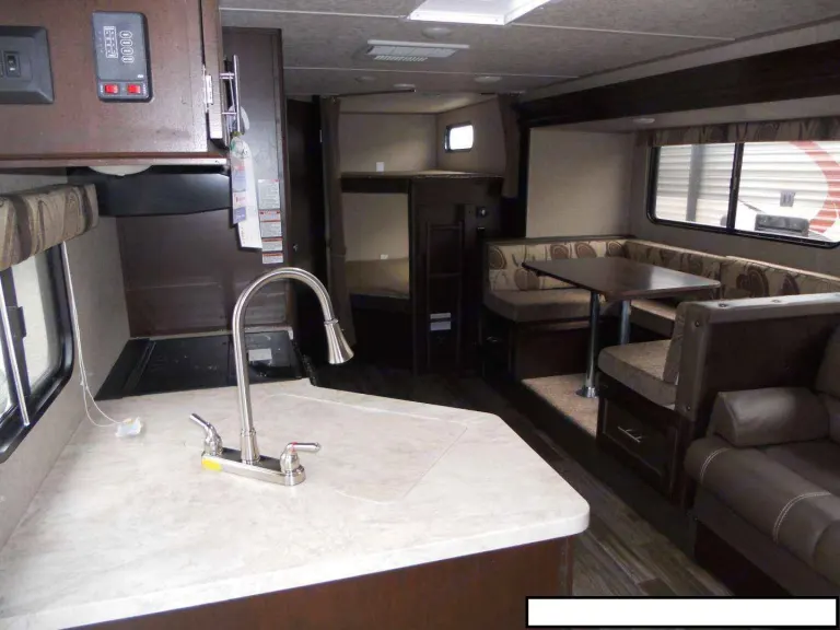 Your family of nine will enjoy each camping trip with this open floor plan large slideout. 9 Sleeping space can be found at the rear set of double bunk beds, convertible dinette, sofa, and front queen bed.