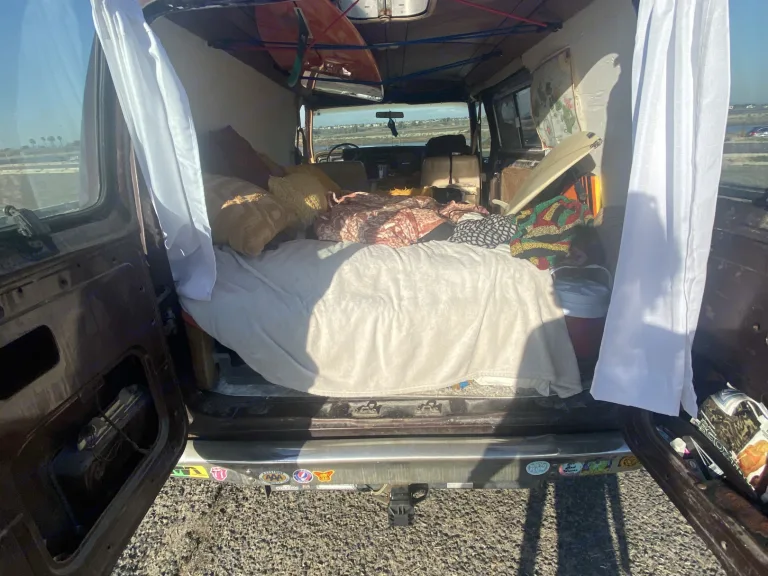 Surf van! Great for a road trip or to stay local. White shag carpet, tons of pillows, small skylight, bunjees to keep boards secure to the inside roof, aux cord/radio, insulated to keep warm. Lock box to hide keys when going for adventure. 2 seats in front. Bed in the back.What's includedPillows and blankets