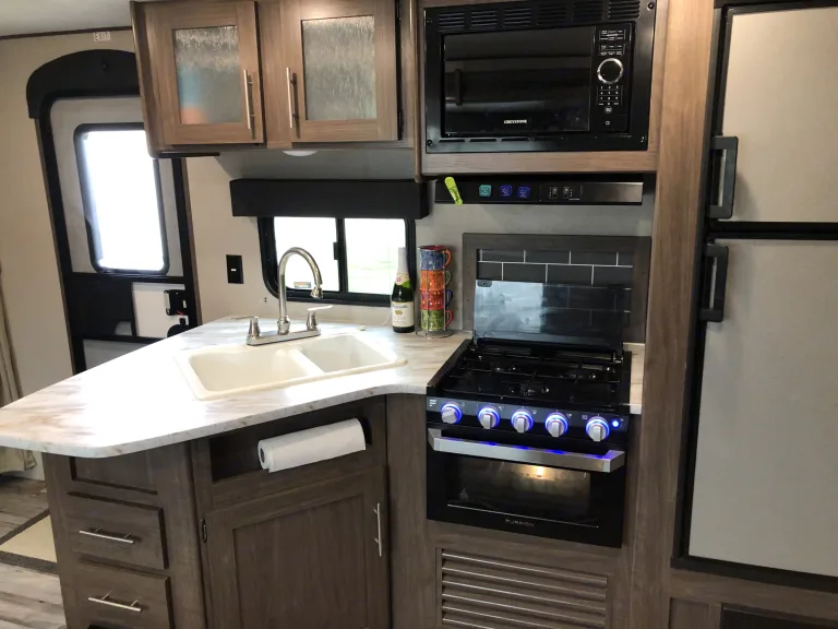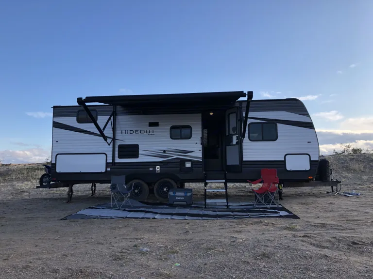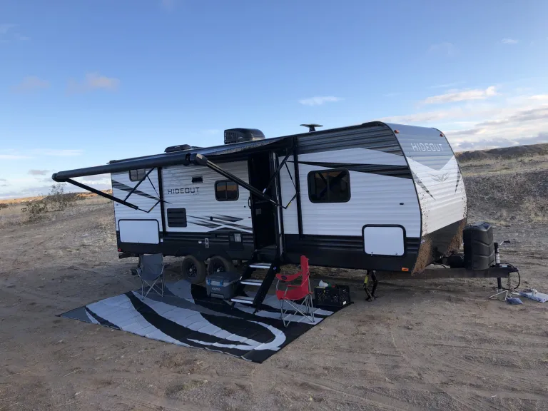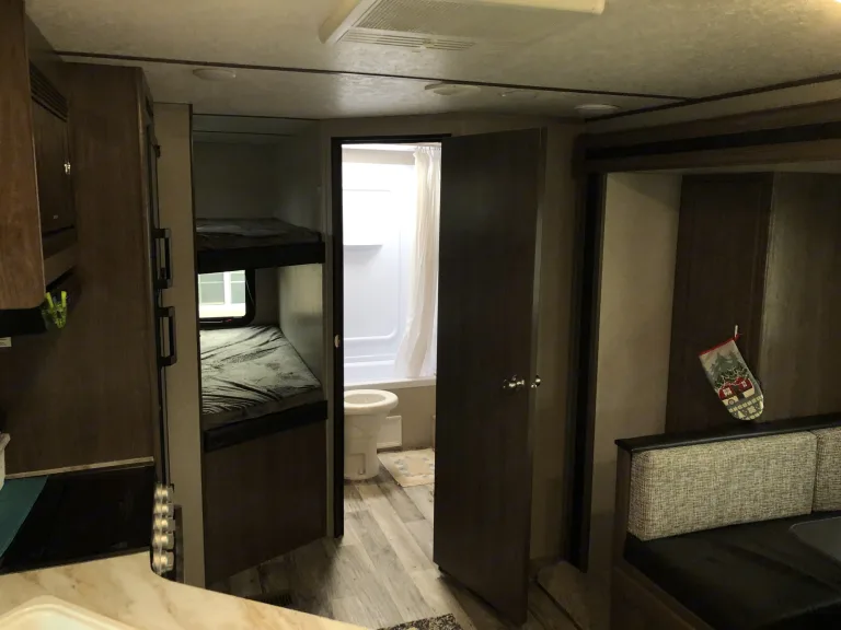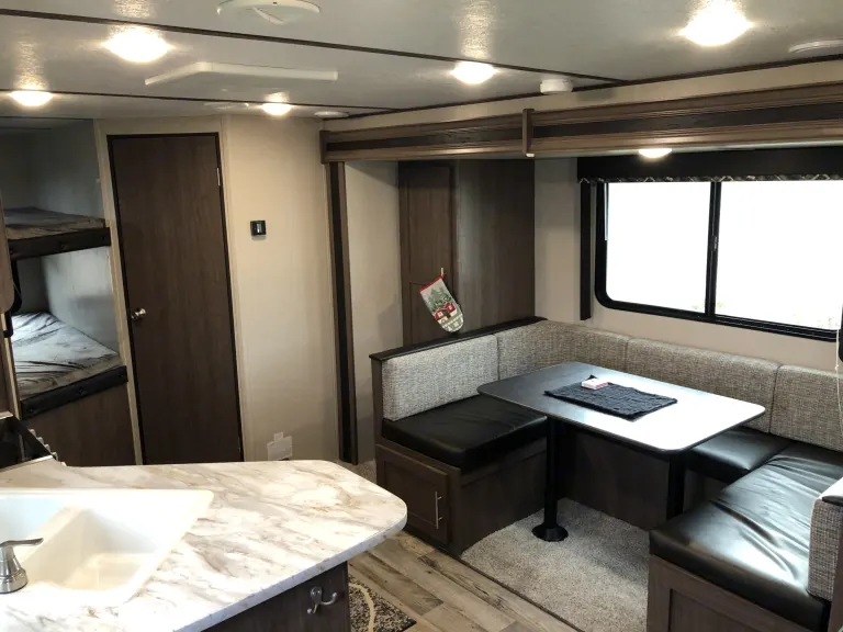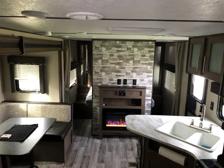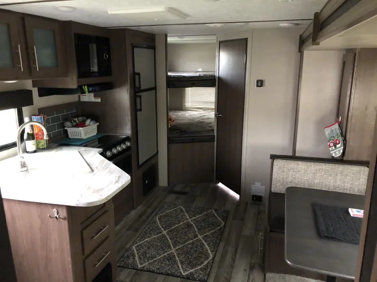 Our 2020 25 ft Keystone Hideout is the perfect trailer for your family getaway! This trailer has one big slide out that opens up the walk way pushing out the dinette and creating a comfortable hanging area. It includes a queen sized bed up front, two full size bunks in the back and if needed the dinette will also turn into a full size bed. It will comfortably sleep 6 adults. The inside also comes with an electric heater/ fireplace, AC unit on the roof, oven, stove, microwave, a shower/tub and more. Generator not included but I do have one for an additional cost per day.
