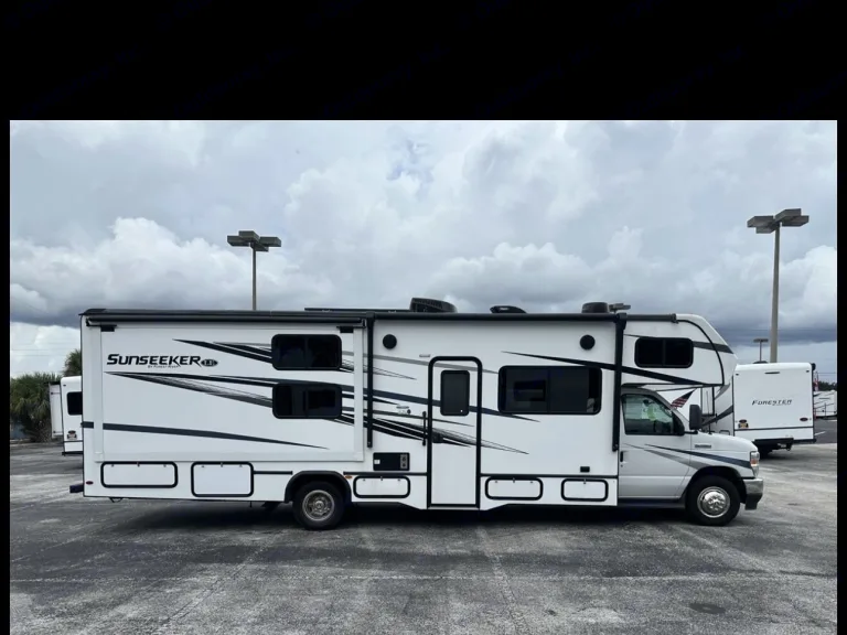 This Forest River Sunseeker is a luxurious and spacious Class C motorhome designed to elevate your travel experience to new heights. Powered by the all new 7.3L V8 engine, it’s got plenty of power to climb hills. The interior offers a spacious and well-appointed living space that is sure to impress even the most discerning travelers. Whether you're embarking on a weekend getaway or a cross-country adventure, the Sunseeker's interior will make you feel right at home. It features premium furniture, high-quality flooring, and elegant finishes that create a refined and inviting atmosphere. The kitchen area is equipped with state-of-the-art appliances, including a house sized refrigerator, microwave, stove, and sink, allowing you to prepare delicious meals on the go with ease. The spacious dining area provides ample seating for you and your travel companions, making it the perfect spot to enjoy a meal together or simply relax and unwind. The master bedroom features a cozy queen-sized bed with plush bedding and ample storage space for all your travel essentials. Additionally, the motorhome includes bunk beds for additional sleeping accommodations, making it ideal for families or groups of friends traveling together. The bathroom is equipped with a shower, toilet, and sink, providing all the comforts of home while you're on the road. The premium fixtures and finishes in the bathroom add a touch of luxury to your travel experience, ensuring that you can freshen up and rejuvenate after a day of adventure.What's included• Toilet paper and all required hoses and cables for a hook up campsite, other extras such as kitchen utensils, bedding, bbq, bike rack and more can be added at check out