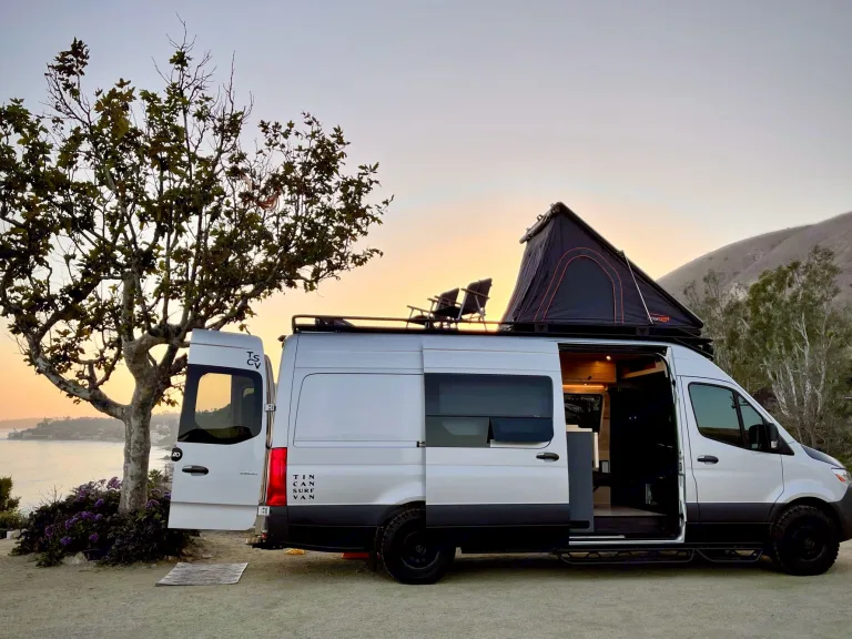 Van is nicely equipped with a cooktop, refrigerator, sink, hot water heater, outdoor shower, dining set up for 4-6, and a queen bed. There is a Roof Nest on the roof rack that will sleep 2 more, bring sleeping bags! Since we have kiddos, we added a DOT approved second seat with seatbelts for 2, it folds up and out of the way when you arrive at your destination. The van has 2 Lagun tables with bases in 3 places for flexibility in placement. Plenty of storage through out and tons of space to store suitcases or larger items on the roof. 32" Samsung TV is connected to the wifi for streaming live tv as well as Netflix, Apple TV, Amazon, etc. Our wifi is on steroids so as long as there is cell service you can easily power multiple devices; work from the road or watch a movie! Sprinter has Apple Car Play, 360* Cameras, swiveling front seats, and tons of cup holders!What's includedVan comes fully equipped with: