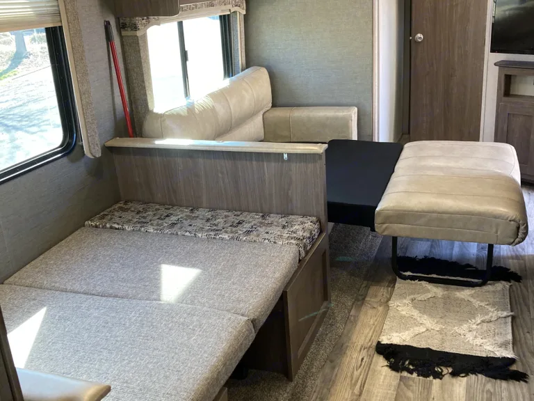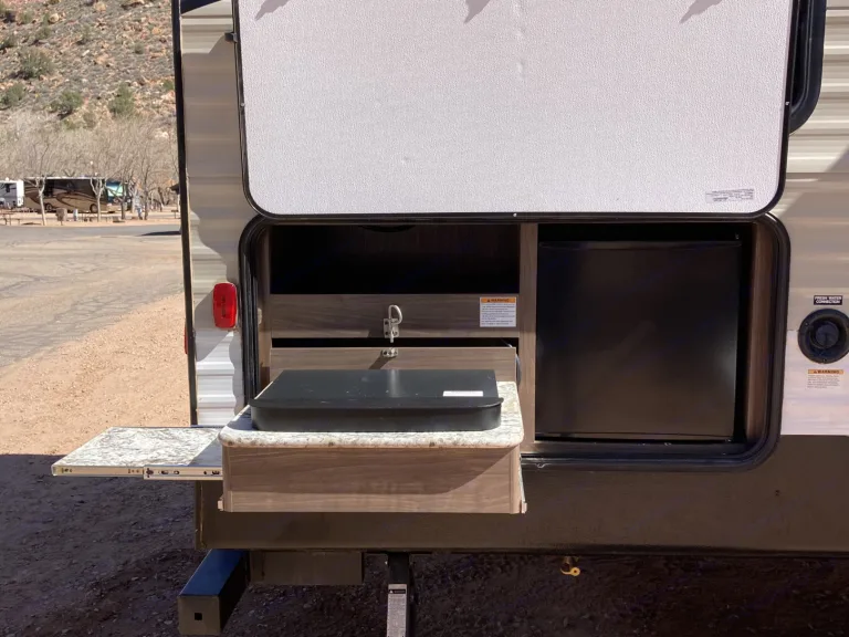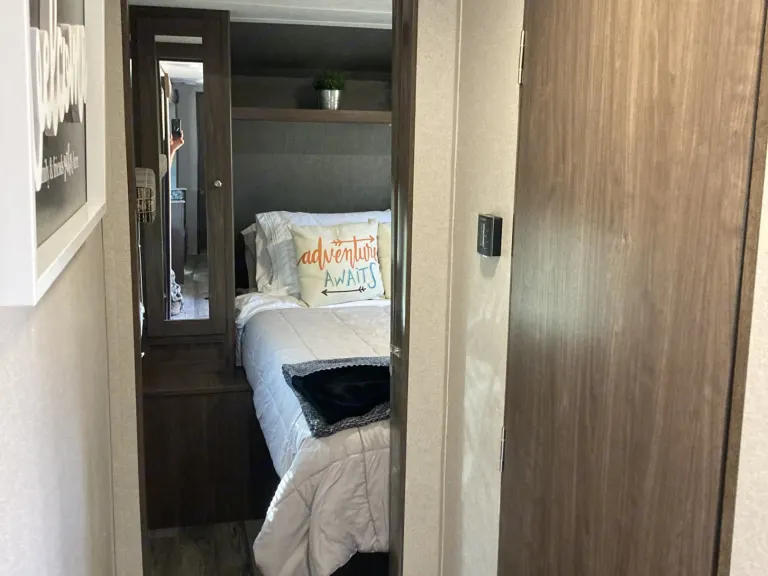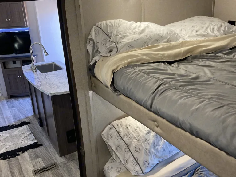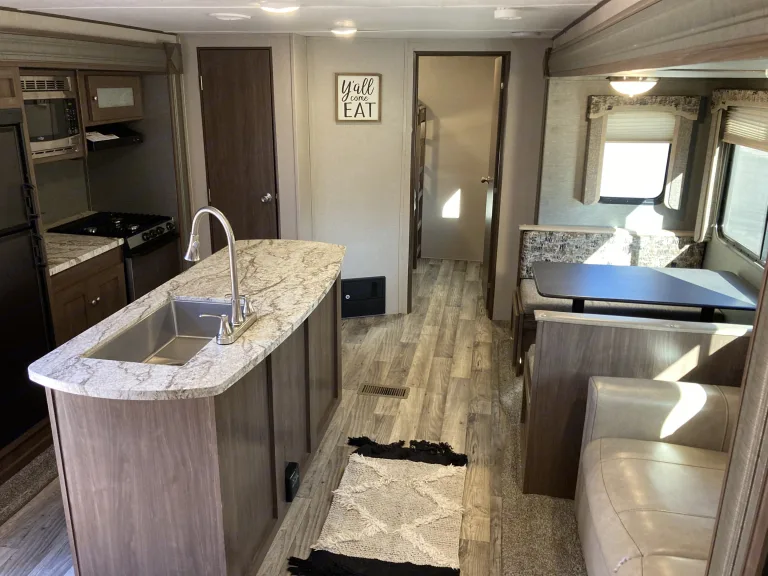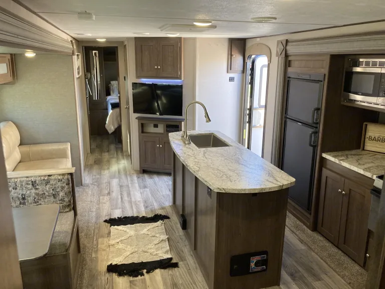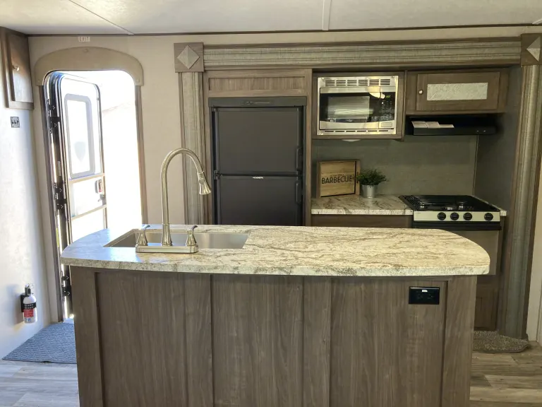 Island kitchen InsideThis trailer is our 2nd largest. With 2 slideouts, the living room area and kitchen makes for a huge space. The best part is the separate bedroom with bunks for the kids.Delivery Only in and around Zion National park*Campground Reservation Requirements*