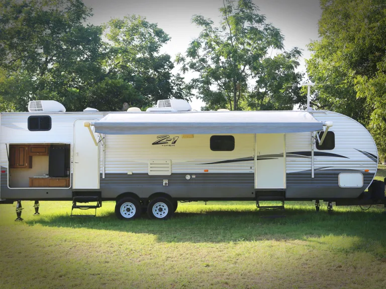 This is a very versatile bunkhouse trailer that is built to house the entire family and then some. With 5 beds in the rear of the camper, you just have to see it to believe. The front queen bed allows mom and dad some alone time and the rear bedroom is great to lock away, opps I mean let the kids have their own place to get away.Exterior