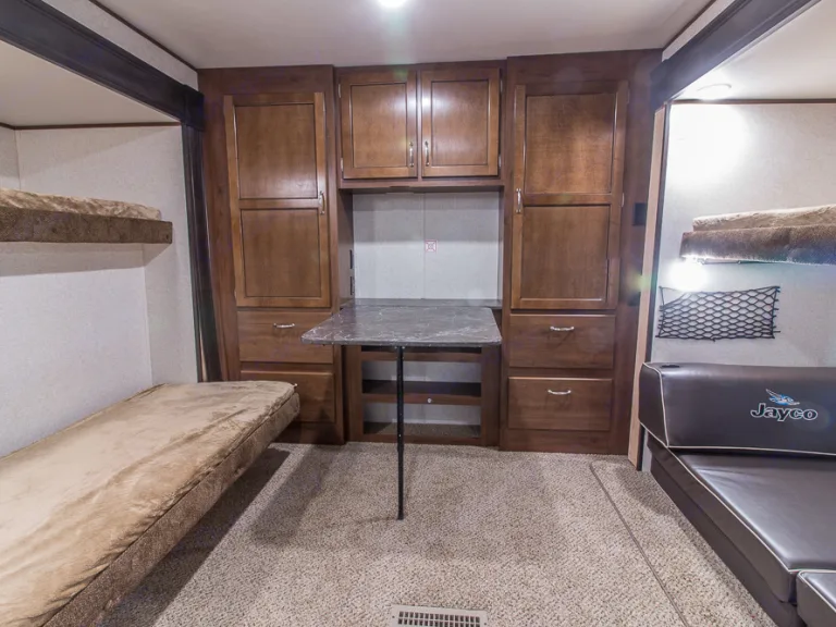 Our 2017 Jayco Flight bunkhouse is a new ready for anything camper! If you are looking for a camper with Tons of space, you've found it. It's fully equipped (see 'why pick this camper over another' below) and has 3 slide outs. Everything is powered for a hassle-free setup. The master bedroom has plenty of storage space and a comfortable queen size bed. The main living area is very spacious and also has plenty of storage. The table and sofa make down into two extra beds for those needing to sleep extra. The kitchen and bath come fully stocked with utensils and toiletries. The bunkhouse area offers two sliders (big fun area) with 3 bunks and a full-size bed, perfect for kids or adults. Camper sleeps up to 14. (7 beds/bunks and lots of extra space)Towing