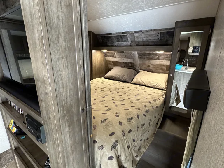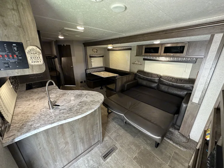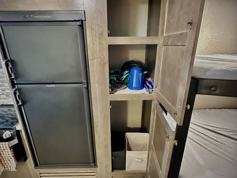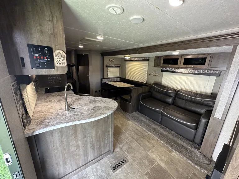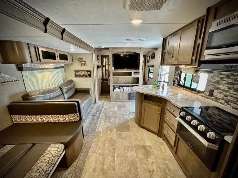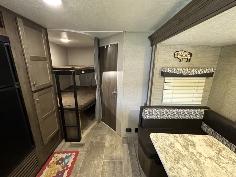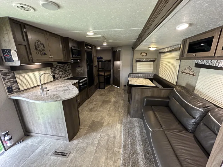 Awesome floor plan for a family! We love it and you will too!Private queen master bedroom in the front with upgraded memory foam mattress and at the rear, cozy bunks that kids will love. Two additional hideaway beds on the couch (adult size) and dinette (kid size) offer more sleeping room if needed (will need to bring own linens, pillows and blankets if using dinette or pull out couch.) Sleeps 10 but more comfortably 6-8. The Queen bed has sheets, comforter and two pillows. Bunks will have a top sheet. (Please bring own bedding or sleeping bags for bunks and pullout sofa.)You can also bring your own linens for queen bed if you prefer. Just let me know and I will remove our stuff.Living space features 32” tv with sound at and dvd/cd and Bluetooth. Random assortment of dvd’s. Indoor/outdoor speakers to enjoy music while at the campfire or playing a round of cornhole.The fully stocked kitchen has a large refrigerator with a freezer, 3 burner stove, oven and microwave. Stocked with cleaning supplies and dish soap as well.