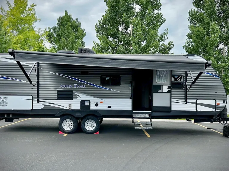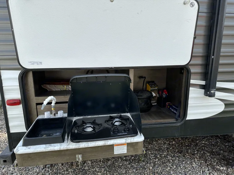 Large dinette table or fold down into comfortable day bed!Bathroom stocked with shampoo, conditioner, body wash, toothpaste, q-tips, flossers, and toilet paper. It features a toilet, sink, and tub/shower.This camper is set up for the cook! Outside features a kitchen with 2 burners and a sink. If you are serious about cooking the. Request our 3 burner campchef with large griddle, Dutch oven and skillet at no extra charge. Quick connect propane line under sink. Also comes with 3 top outdoor table and 10x10 canopy. Set up your outdoor kitchen in style. After all, who wants to cook inside while camping?I just ask that you treat the camper as your own and return it in good condition. Please dump black and gray tanks before return or prepay the dump fee and I’ll gladly do it for you. Don’t worry about refilling propane or generator.This rental is for a family-friendly camping experience. No smoking (cigarettes, marijuana, vaping, or otherwise) inside the camper.Notes:Awning has been disabled due to high damage and failure rate.Trailer tows nicely - delivery also availableRequires 1/2 ton truck or larger with 7 pin plug and trailer brake controller. (One is available to rent if truck not equipped.)Comes with equalizer/stabilizer hitch.Anderson leveling blocks - makes leveling the camper a breeze.Pickup time for me dropping off is set at 3pm. This time is not set in stone. Message me for a time frame that would work for you and we can agree on a time that works for both our schedules.Me picking up or you dropping off is set at 11 am. Again the same rules apply as above. We can agree on a time that works for the both of us.Brand new tires put on 6/3/2023Note: if not plugged into power, you’ll need own generator or rent mine to recharge batteries for at least an hour a night.What's includedAvailable upon request for Free:Campchef 3 burner, griddle and spatula