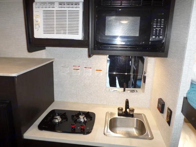 This 2022 lightweight trailer is ready for your vacation adventure fun. This trailer is light enough to be towed with a smaller pickup or SUV. This trailer can sleep up to 4 people comfortably with two large bunks and a table set that converts to a queen sized bed. Note: There is a 2 night minimum for renting this trailer.Amenities include a bathroom and shower, microwave two burner stove, heat, air conditioning, outdoor shower, radio and sink. 3.3 cubic foot refrigerator. However, there is no freezer. This trailer is also modern enough to have direct plug-in USB ports for easy phone charging.This trailer is small enough to get into just about any camping space. However, despite the name Bushwhacker, this trailer has fairly low clearance and is not designed to go off road beyond pavement or graded gravel roads.There are adventures to be had in this small camp trailer. Renting a trailer is a great way to experience RV camping without fully investing in the expense and maintenance involved with ownership. So smell the campfire, hike the wilderness, explore nature, adventure awaits.Disclaimer: We take no responsibility for renter's inability to properly tow, park, and/or operate the systems in said RV trailer. It is the responsibility of the renter to educate themselves and understand the basic and fundamental aspects of towing and operating RV equipment, this includes proper waste disposal procedures. Not responsible for lost or stolen items. There is a limit to battery power which depends on usage and we are not responsible for renter running the batteries out of power.Please Read, Very Important: In order to tow this trailer, by law, you will need to have a brake controller to operate the trailer brakes. IF YOU Show UP TO Pick UP THE Trailer AND DO NOT Have A Brake Controller I Cannot AND Will NOT LET YOU TOW This Trailer. This IS A Liablity Issue That WE Take Very Seriously. YOU Will Either Need TO GET A Brake Controller Installed OF Forfeit THE Amount FOR A Cancellation FEE AS Outlined IN THE Outdoorsy Website Cancelation Costs OR GET A Brake Controller Installed. NO Exceptions!What's includedIncluded with this trailer are general kitchen supplies such as pots, pans, knives, forks, spoon, coffeemaker, dish washing, and cleaning supplies. We also include 4 sleeping bags and pillows that are washed after every camping trip.Recommendations