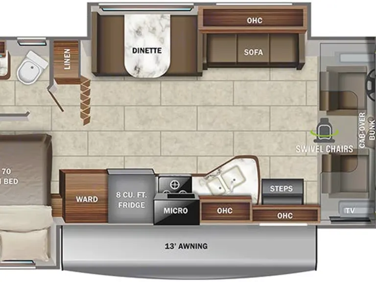 This class C is amazing. Has the overhead bed, couch bed, dinette bed, and the queen bed in the back. Could sleep 6-8 comfortably. Lots of storage inside and out. Comes with everything you need to have a great vacation- sheets, sleeping bags, blankets, towels, dishes, utensils, hot dog sticks, soap, shampoo, conditioner, pots and pans, etc. Nice comfortable memory foam mattress topper. Perfect size for taking anywhere.