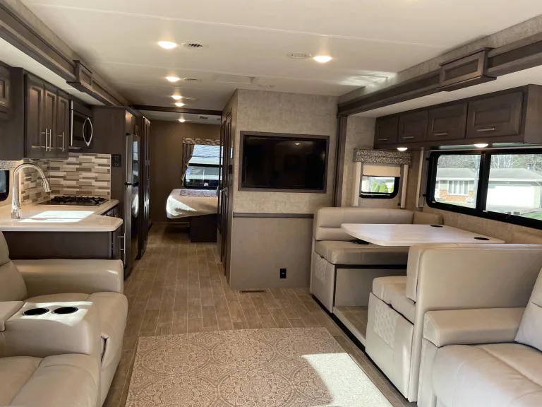 This 2021 Class A motorhome has two slide-outs creating a spacious inside living area and sleeps up to 8