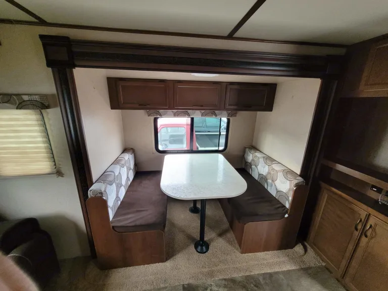 This is a very homey 27' trailer. It offers a private master bedroom, a full size bathroom, a full kitchen with small oven, microwave, large fridge, coffee pot, toaster oven, etc. Couch for lounging in the living area, lcd tv, large dining booth, large slide out for extra living space. Electric awning to create outdoor living space as well. The awning has a led lights strip for outdoor lighting. Electric tongue jack makes hooking up the trailer a breeze.Sleeps 4 comfortablyWhat's includedLinens for the queen bed are included.
