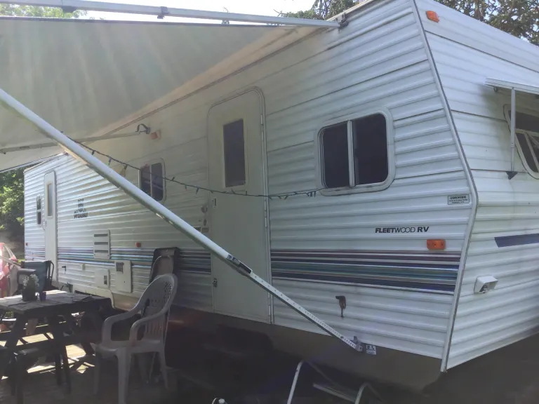 This travel trailer has a lovely queen sized bed with side ends and convenient light at your fingertips for late night reading. Fully equipped kitchen including oven. Tip out with dinette/convertible bed for two children or one adult. One convertible sofa for one adult two children comfortably. And for those that have to work, a wrap around desk is in the front as you come in the front door . Trailer includes disk player and TV monitor, outdoor mini shower and propane grill. Comfortable for 2 adults and 2 children , or four adults. Though can accommodate 6.