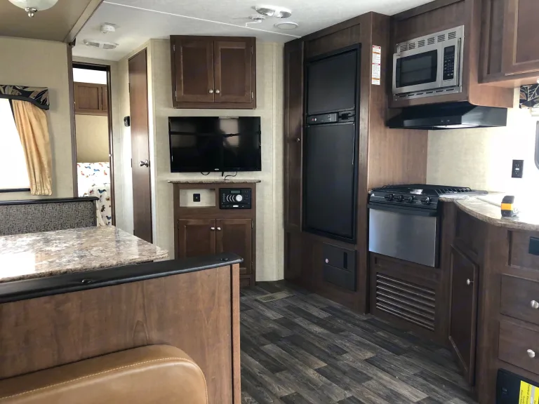 This almost-new Luxury Keystone travel trailer is loaded with features. She'll fit 6 adults without a problem! The bedroom, with walk around full memory foam mattress has a separate exterior entrance. It also sports it's own 4k, 48" SmartTV. Netflix is included! You'll have to bring the chill.Incredibly comfortable leather sofa and chairs greet you on entry. Plenty of interior lighting and loads of windows both big and small make for a very open experience. The large dining space is nicely set-off with all-maple cabinetry. For sleeping arrangements, the dining booth and leather sofa both fold out to comfortable queen-size beds. The very large slide adds a great deal of living space. A complete central vac system makes mess cleanup a breeze.Large refrigerator and freezer operate three ways in a system optimized for most efficient usage. They're battery powered while on the road or boondocking. The same system will operate exclusively, or in tandem, on propane. When hooked to shore-power, A/C runs everything. Pumps onboard will give you line-pressure water anywhere you happen to be. AC/Propane gives you instant hot water.For cooking, a three-burner stove and oven make home-cooked meals onboard a welcome addition. A full set of pots, pans, stoneware and cutlery is included in the rental. A microwave adds meals with a quickness. You'll also have a toaster and a quality coffee maker. Because we know what's important.The electronic package leaves nothing to be desired. There are plenty of Gfci 110v outlets to be found. Bedside, in the bathroom, on either side of the couch and chairs, and in the kitchen as well. An HD antenna will give you excellent service even when you're outside city limits! The 48" 4k SmartTV in the living room is linked to an in-wall head-unit. The 3-zone sound system functions as a Bluetooth stereo, surround sound for the television, and a dvd player. You can choose where you want the sound - in the kitchen, living room, through the excellent outdoor speakers, or any combination. The living room TV removes from the wall mount with an easy motion and transfers quickly to a matching mount outside.Outside the unit, plenty of lighting is just where you want it. Both exterior doors are screened, and covered under a 20', electrically retracting awning. There are outdoor power outlets, as well as a cable jack right next to the outdoor television mount.The unit is approximately 6,600 lbs, 31' long, and 11' in height. The tandem-axle frame is equipped with excellent trailer-brakes for vehicles so equipped and safety breakaways. New tires compliment the tow experience. An electrically powered jack with illumination makes hooking up a breeze. A Reese anti-sway hitch is included in the rental for safety and peace of mind while towing.***A generator is available for rent in the add-ons menu if you're going off the grid***Your rental will come with empty waste tanks, a full 43 gallons of drinkable fresh-water in the storage tank, and topped off, dual 40lb propane tanks for plenty of use time.