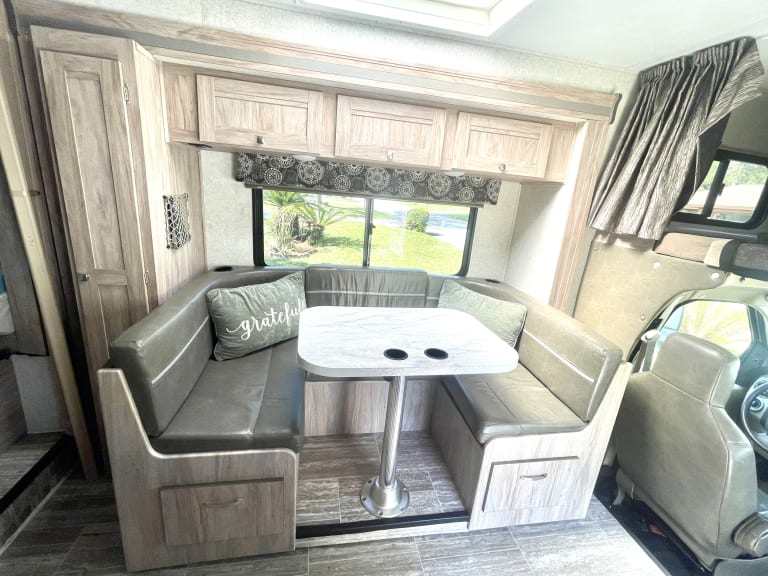 Planning your next adventure has never been easier than with this totally self-sufficient 2019 Sunseeker 2420DSF. This Class-C RV comes fully equipped with all the comforts from home, but ready to be driven out into the wild. With the power and efficiency of the Ford Triton V10 (gasoline), you'll be able to conquer anything the road throws at you, with ease. This RV is fully capable of off-site boondocking should you prefer the solitude of making your own camp site off-grid. On-board gas powered generator, 44 gal fresh water holding tank, 42lb on-board propane tank all come included. We also include a 32ft 30amp power cable, sewage hose, and 20ft water line for use at RV-sites w/hook-ups. There is a trailer hitch capable of towing 7,500lbs should you want to bring along some additional "toys," as well as Firestone "Ride-Rite" air suspension system to provide an amazingly comfortable ride on the go. When you park and settle into your destination, there is a 4-point automatic self-leveling system that will ensure your leveled with ease, no need for blocks and manual lifting here. Inside you will find an amazing floor plan with 7' tall ceilings, 2 slide outs (living room, bedroom), 42'' LED TV, JVC multi-media entertainment system with upgraded surround sound. Prepare a full meal in the fully stocked kitchen. Comes with full-size refrigerator/freezer, gas oven, 3 burner stovetop, convection microwave, and pull-out pantry. Pots, pans, and dinnerware are included free of charge, as well as a coffee maker. Sleeping arrangements include 2 queen beds (main bedroom and overhead cabin) and one convertible dinette full/twin. No need for any blankets, we've got you covered with fresh linens, pillows, and extra comforters for cold nights. Easily extend the electronic awning outside with the push of a button, pull out the camping chairs, and enjoy your time outside with nature. The possibilities are truly endless with this RV. What's includedKitchen: