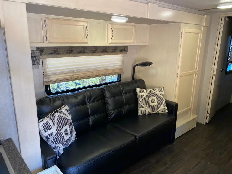 Total comfort... Your best sleep ever on a Queen Size Sleep Number bed with complete firmness control for each side and a heated mattress pad with three zones on each side available for cold-weather camping. Above the bed is a Fantastic Fan in the ceiling with a remote control.The large open Kitchen has a double sink, microwave, oven and gas cook top with a three-way refrigerator (AC, DC or gas).For entertainment there's a tv with a rotating antenna, cable hook up, DVD player and radio with Bluetooth. Speakers are both inside and out with separate volume control.Tons of storage including under the seats in the dinette and under the master bed.The load-leveling hitch makes this trailer rock steady and easy to tow.