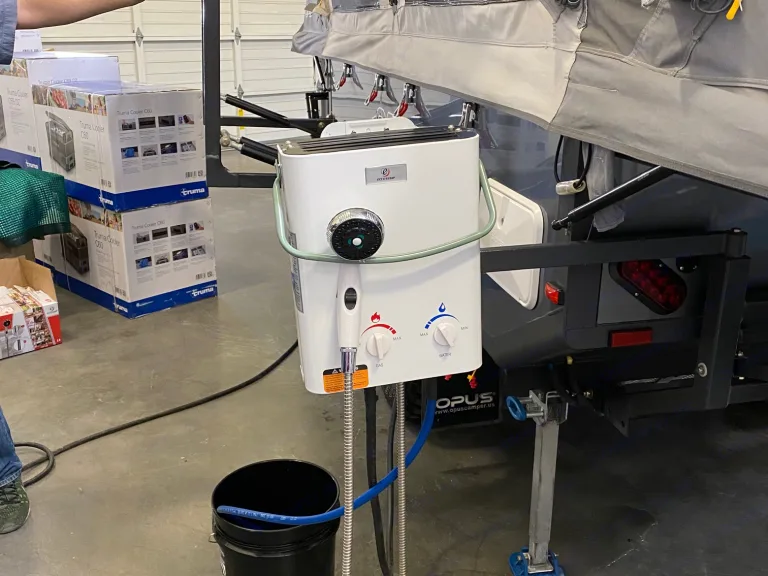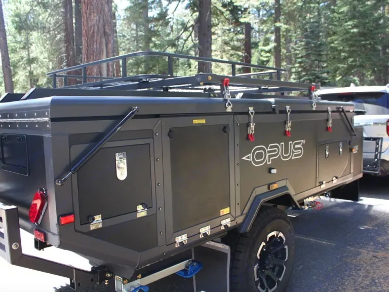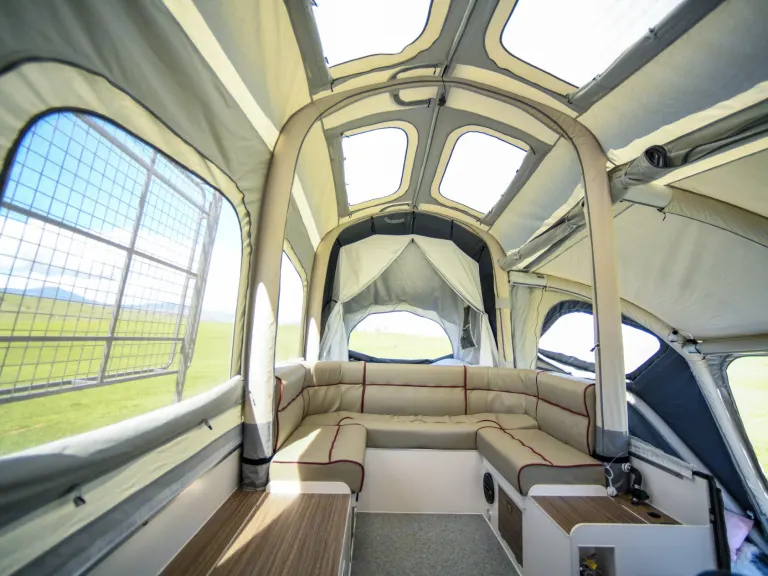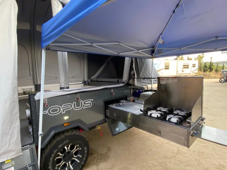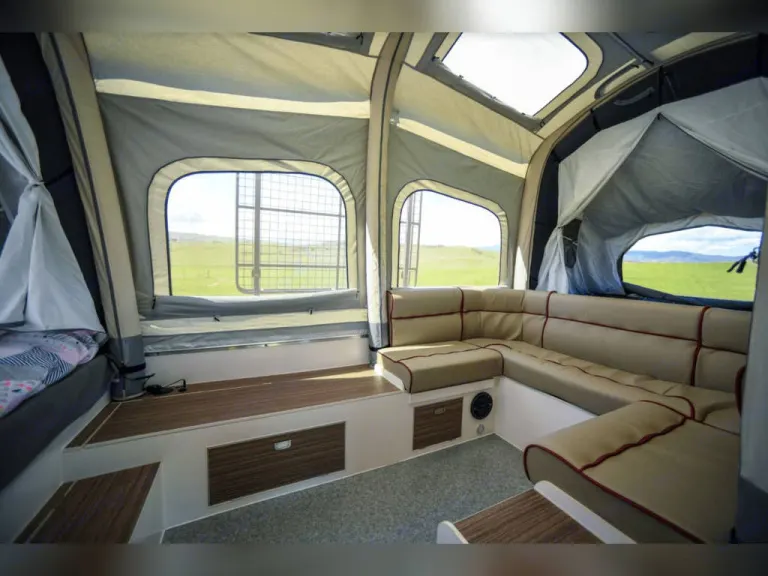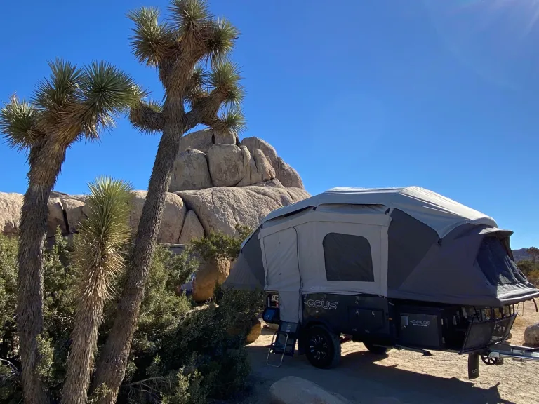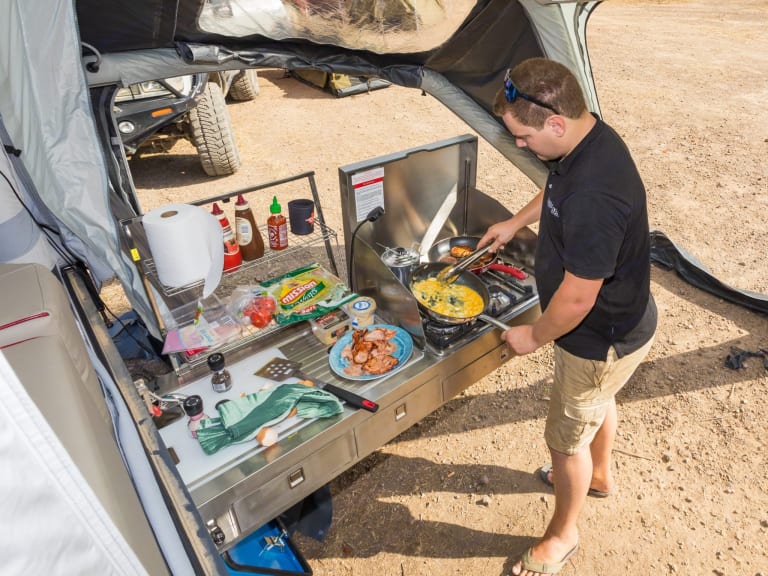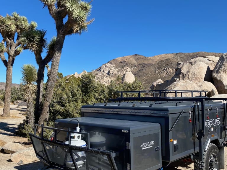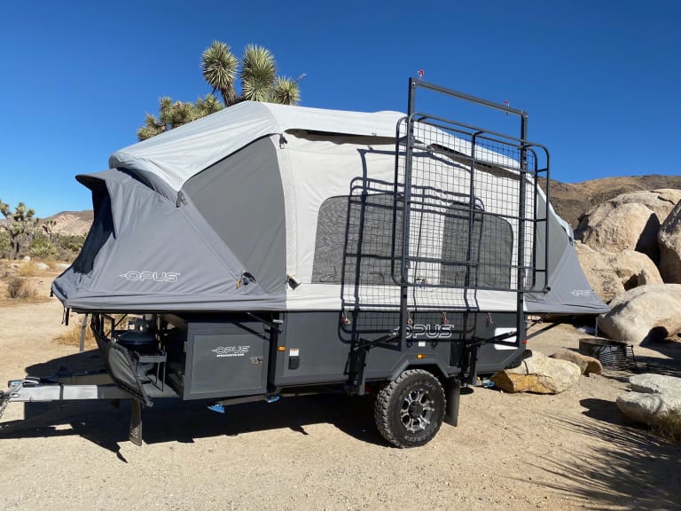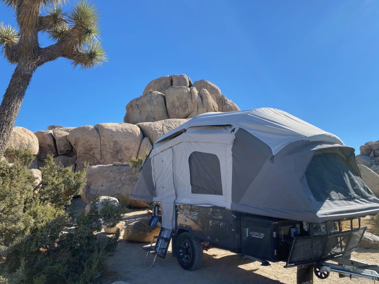 Tough luxury… This rugged off-road camper was developed in Australia and designed to go anywhere a 4-wheel drive can tow it. Everything you need to cook and eat your meals is included… except food ;) It features the "Lock and Roll" articulating hitch, fully independent suspension with more than 12 inches of clearance, 8 foot high ceiling with inflatable beams, a large stainless-steel pull-out outdoor kitchen and a chest style DC refrigerator (can also be used as a freezer). We added memory foam mattress toppers for comfort, and the 2 double beds will have freshly washed mattress pads and be ready for your sheets, blankets or sleeping bags. We timed our first setup, in the dark, at less than 7 minutes! An on-demand hot shower, solar panels and Cinema package are available.What's includedPot, pan, utensils, cutting board, bowls, plates, vacuum-insulated mugs, biodegradable soap, jerry cans, fan, memory foam and propaneRecommendationsCamp free in Anza-Borrego or in any campground... No hookups are required!Other things to noteThe dry weight of this camper is only 2870 pounds, so it can be towed by a wide variety of vehicles. You will need a 2 inch receiver and a 7-pin round electric plug on your vehicle. It has 2 20 gallon fresh water tanks and 2 100 amp hour AGM batteries.