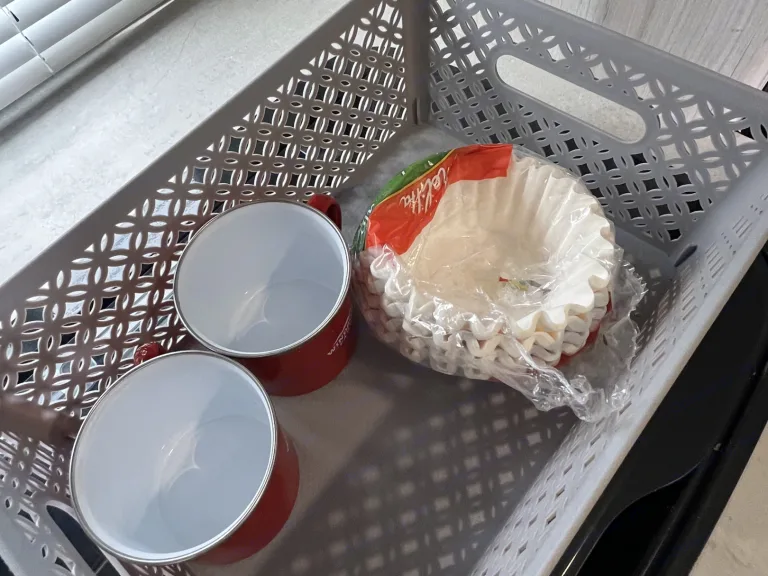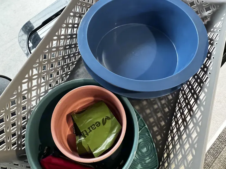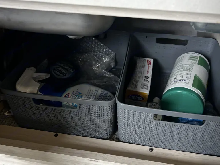 Organized RV rental supplies: a gray bin with a black first aid kit and a Holmes portable fan for your trip.. Winnebago Hike 2022