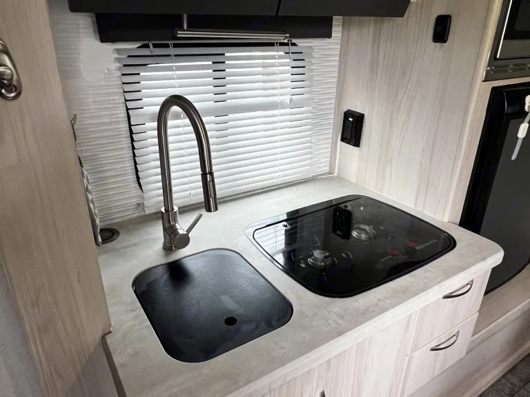 • Return to a cozy basecamp with a full kitchen, shower, and power awning