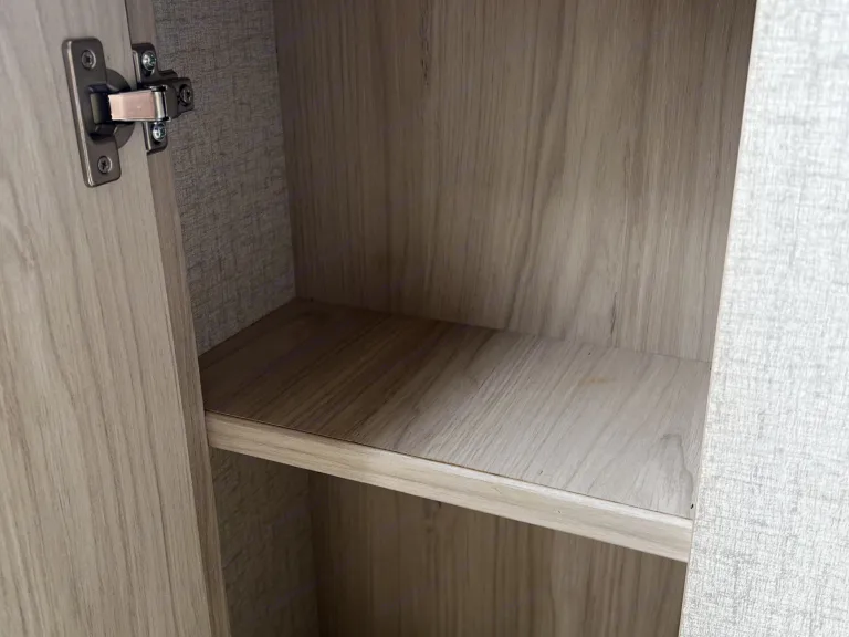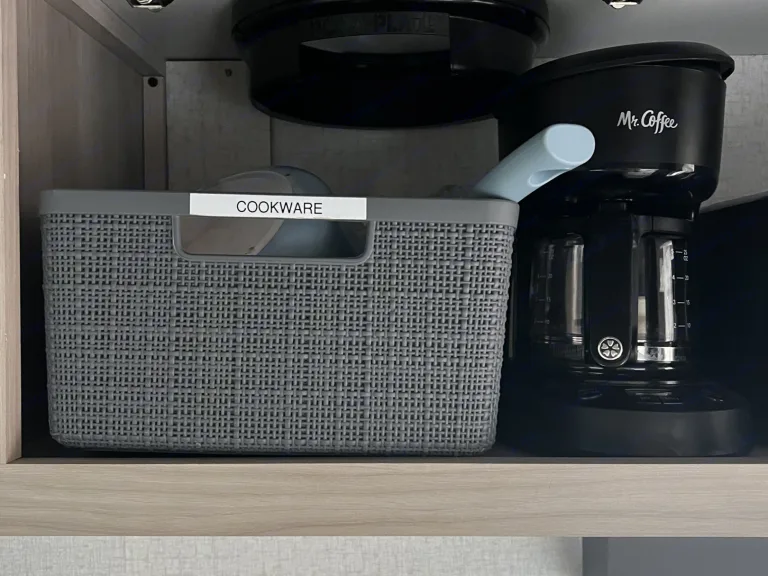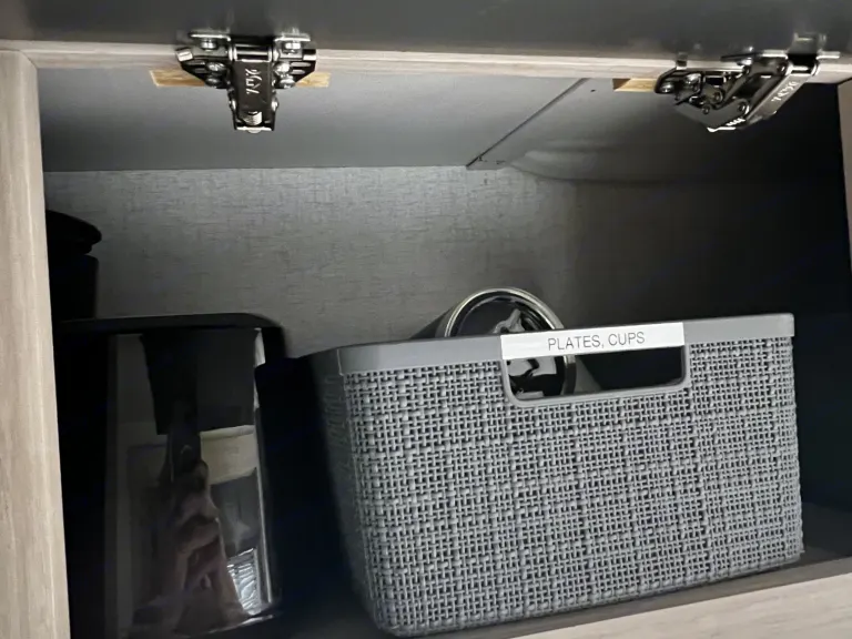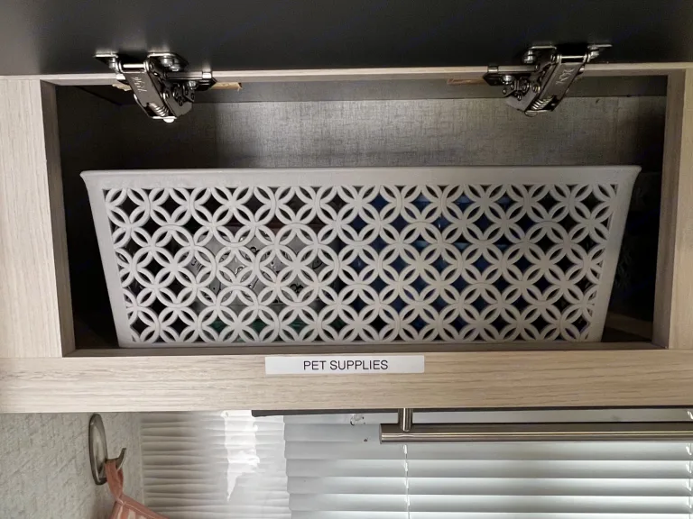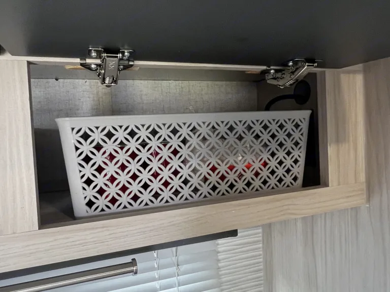 Organized RV rental cabinet. A labeled storage basket holds "GAMES, REMOTES, WIFI, CHARGING CORDS" for easy access.. Winnebago Hike 2022